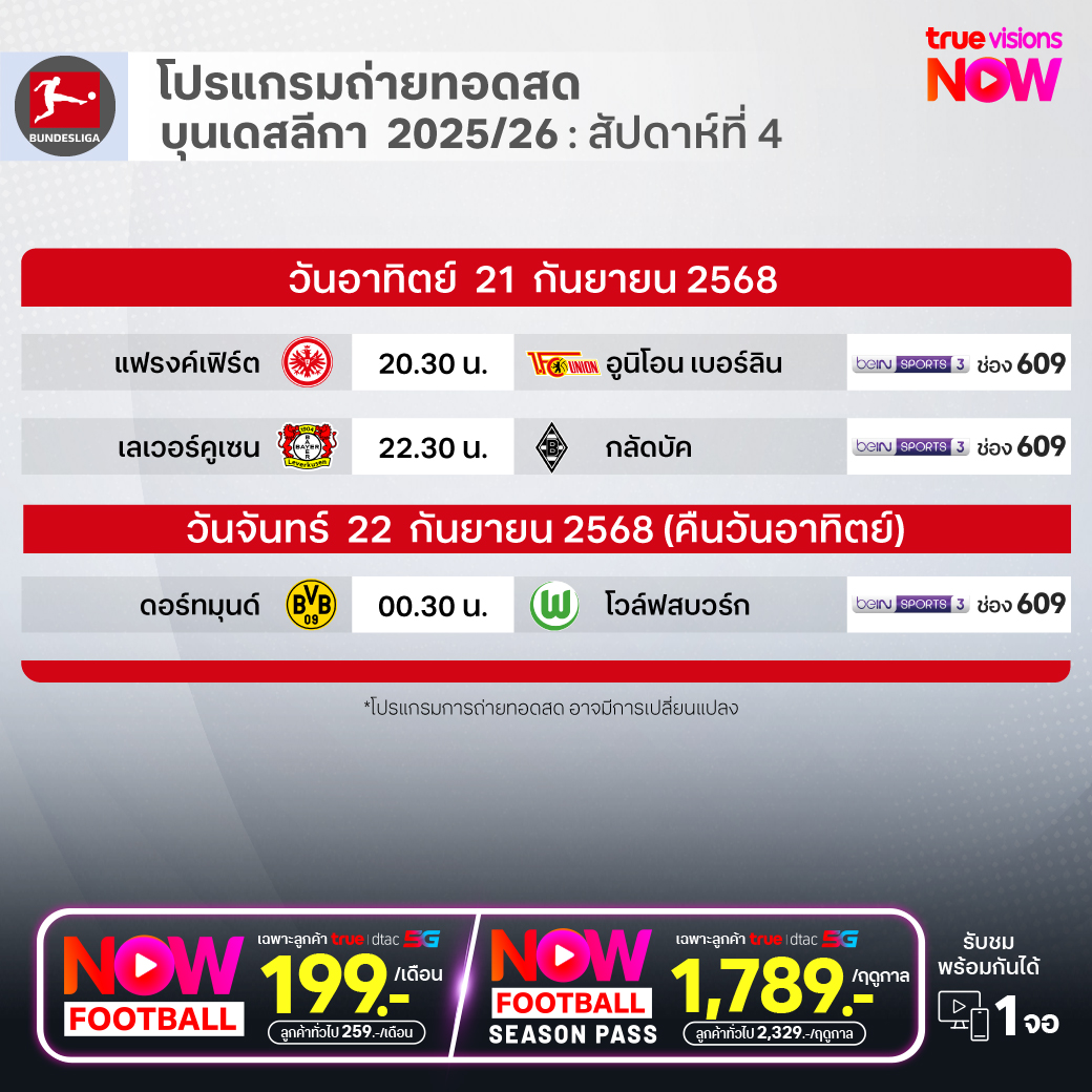 Dortmund vs Wolfsburg เวลา 00.30-02.30 ทางช่อง beIN 3 (609)