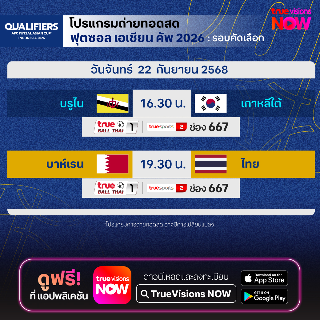 บรูไน พบ เกาหลีใต้ เวลา 16.30-18.30 ทางช่อง True Ball Thai 1 / TS 2 (667)