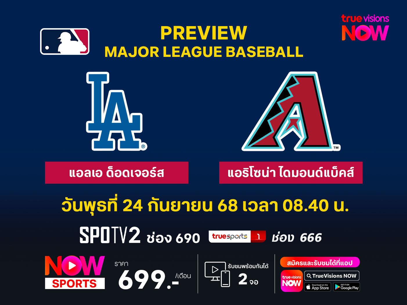 MLB เมเจอร์ลีก เบสบอล ถ่ายทอดสดทางแอพพลิเคชั่น ทรูวิชันส์นาว SPOTV2 (690)