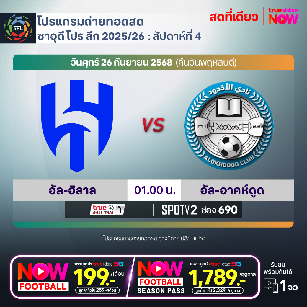 Al-Hilal vs Al-Okhdood เวลา 01.00-03.00 ทางช่อง True Ball Thai 1 / SPOTV2 (690)