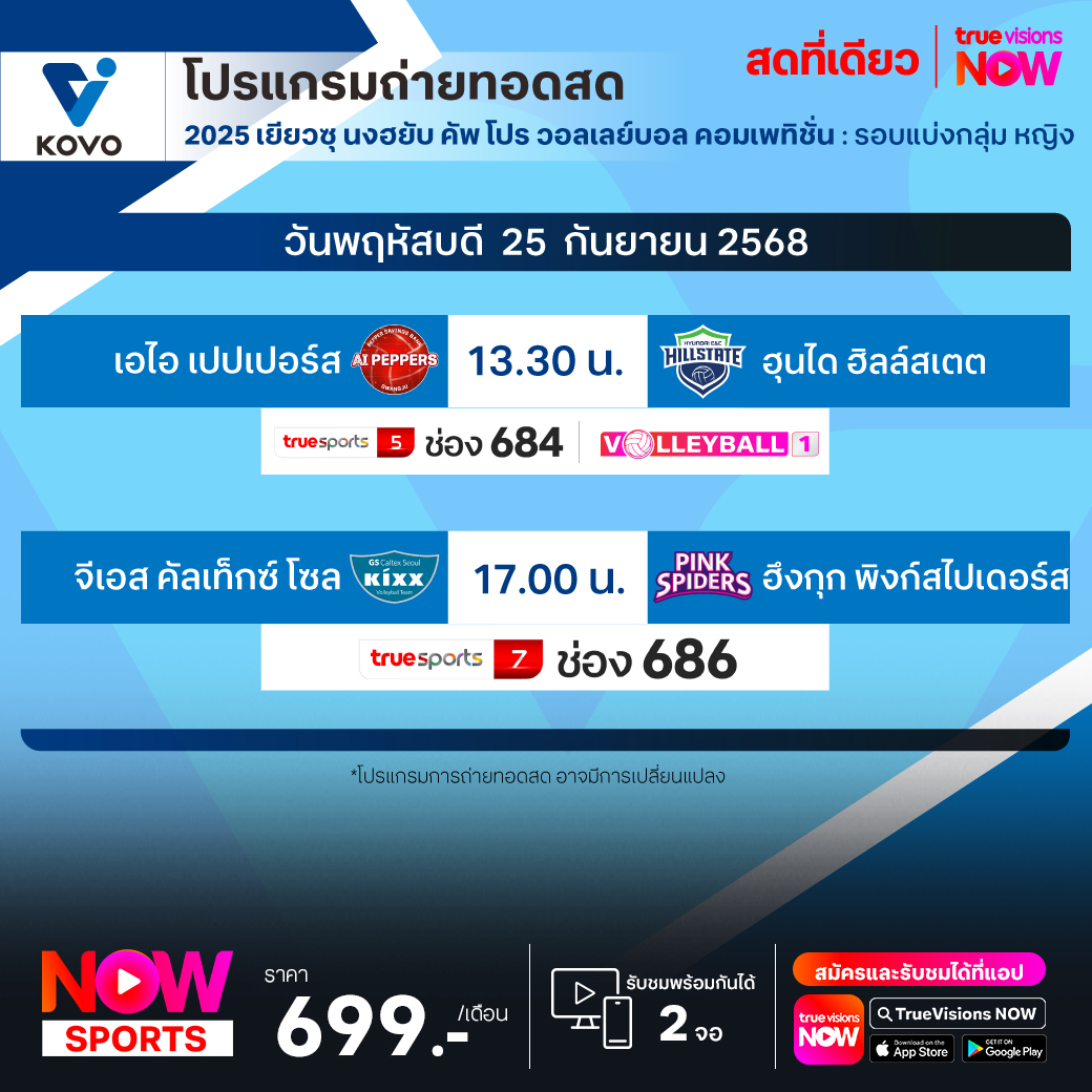 เอไอ เปปเปอร์ส พบ ฮุนได ฮิลล์สเตต เวลา 13.30 ทางช่อง TS 5 (684) / Volleyball 1