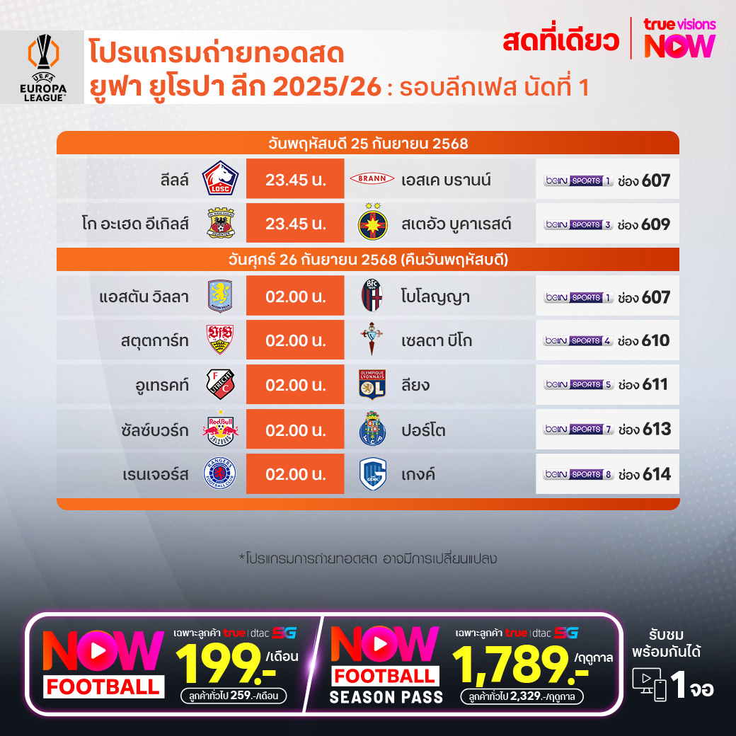Lille vs Brann เวลา 23.45-01.45 ทางช่อง beIN 1 (607)