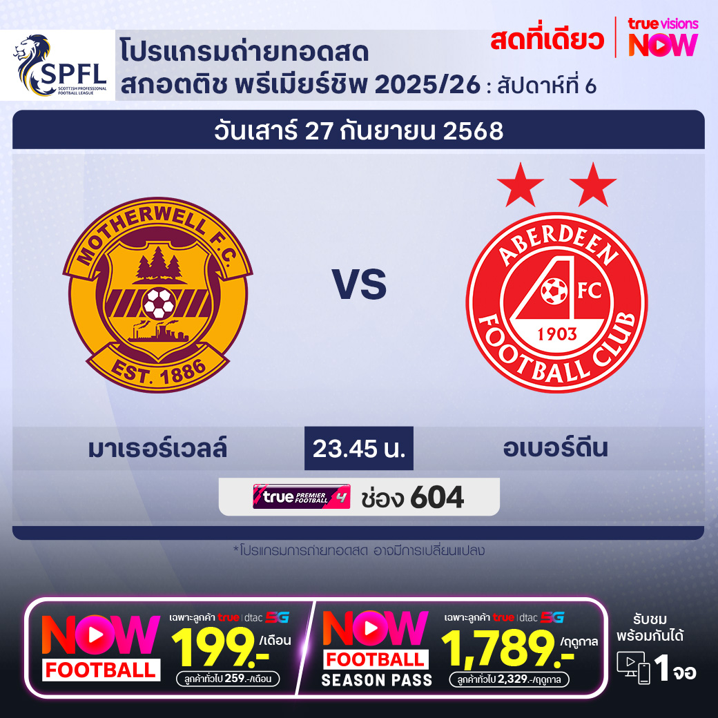 Motherwell vs Aberdeen เวลา 23.45-01.45 ทางช่องTPF 4(604)