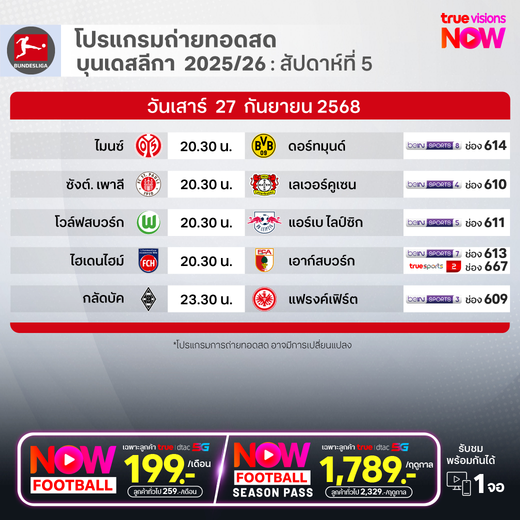 วันนี้มีอะไรดูที่ ทรูวิชั่นส์ ประจำวันเสาร์ที่ 27 กันยายน 68 ยังคงมีกีฬาที่น่าสนใจให้ได้ตามลุ้นตามเชียร์กันเหมือนเดิม โดยในส่วนของฟุตบอลยังมีศึก ลา ลีกา สเปน, บุนเดสลีกา เยอรมนี, กัลโช่ เซเรีย อา อิตาลี, สกอตติช พรีเมียร์ชิพ และ ซาอุดิ โปร ลีก ให้ได้ตามเชียร์กันต่อ ส่วนกีฬาอื่นๆ ยังมีศึก โมโต จีพี รายการ กรังด์ปรีซ์ ออฟ เจแปน, เทนนิส เอทีพี ทัวร์ รายการ เจแปน โอเพ่น และ ไชน่า โอเพ่น, ดับเบิ้ลยูทีเอ ทัวร์ รายการ ไชน่า โอเพ่น, กอล์ฟ เดอะ ไรเดอร์ คัพ 2025, เวิลด์ สนุกเกอร์ ทัวร์ รายการ บริติช โอเพ่น, แบดมินตัน บีดับเบิ้ลยูเอฟ รายการ โคเรีย โอเพ่น, ยูเอฟซี ไฟต์ ไนท์ และ รักบี้ แชมเปี้ยนชิพ งานนี้ ทรูวิชั่นส์ จัดเต็มให้ชมกันถึงบ้าน