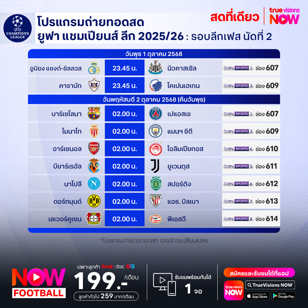 วันนี้มีอะไรดูที่ ทรูวิชั่นส์ ประจำวันพุธที่ 1 ตุลาคม 68 ยังคงมีกีฬาที่น่าสนใจให้ได้ตามลุ้นตามเชียร์กันเหมือนเดิม โดยในส่วนของฟุตบอลยังมีศึก ยูฟ่า แชมเปี้ยนส์ ลีก รอบ ลีก เฟส ให้ได้ตามเชียร์กันต่อ ส่วนกีฬาอื่นๆ ยังมีศึกเทนนิส เอทีพี ทัวร์ รายการ ไชน่า โอเพ่น และ เซี่ยงไฮ้ มาสเตอร์ส และเทนนิสหญิง ดับเบิ้ลยูทีเอ ทัวร์ รายการ ไชน่า โอเพ่น, กอล์ฟ แอลพีจีเอ ทัวร์ รายการ ล็อตเต้ แชมเปี้ยนชิพ และ เมเจอร์ ลีก เบสบอล โพสต์ซีซั่น ไวลด์การ์ด งานนี้ ทรูวิชั่นส์ จัดเต็มให้ชมกันถึงบ้าน