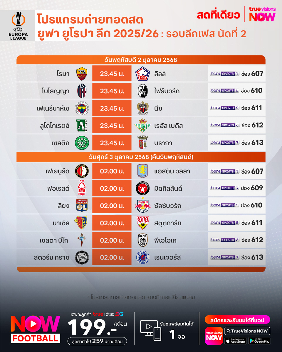 วันนี้มีอะไรดูที่ ทรูวิชั่นส์ ประจำวันพฤหัสบดีที่ 2 ตุลาคม 68 ยังคงมีกีฬาที่น่าสนใจให้ได้ตามลุ้นตามเชียร์กันเหมือนเดิม โดยในส่วนของฟุตบอลยังมีศึก ยูฟ่า ยูโรป้า ลีก และ ยูฟ่า คอนเฟอเรนซ์ ลีก รอบ ลีก เฟส ให้ได้ตามเชียร์กันต่อ ส่วนกีฬาอื่นๆ ยังมีศึกเทนนิส เอทีพี ทัวร์ รายการ เซี่ยงไฮ้ มาสเตอร์ส และเทนนิสหญิง ดับเบิ้ลยูทีเอ ทัวร์ รายการ ไชน่า โอเพ่น, กอล์ฟ พีจีเอ ทัวร์ รายการ แซนเดอร์สัน ฟาร์มส์ แชมเปี้ยนชิพ, ดีพี เวิลด์ ทัวร์ รายการ อัลเฟร็ด ดันฮิลล์ ลิงค์ส แชมเปี้ยนชิพ และ แอลพีจีเอ ทัวร์ รายการ ล็อตเต้ แชมเปี้ยนชิพ งานนี้ ทรูวิชั่นส์ จัดเต็มให้ชมกันถึงบ้าน
