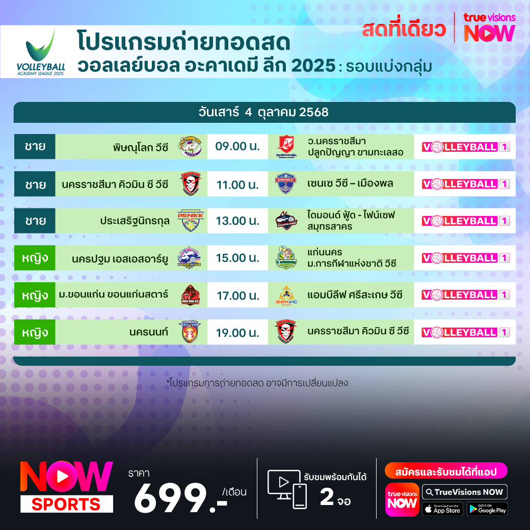 พิษณุโลก วีซี พบ ว.นครราชสีมา ปลูกปัญญา ขามทะเลสอ เวลา 09.00 ทางช่อง Volleyball 1