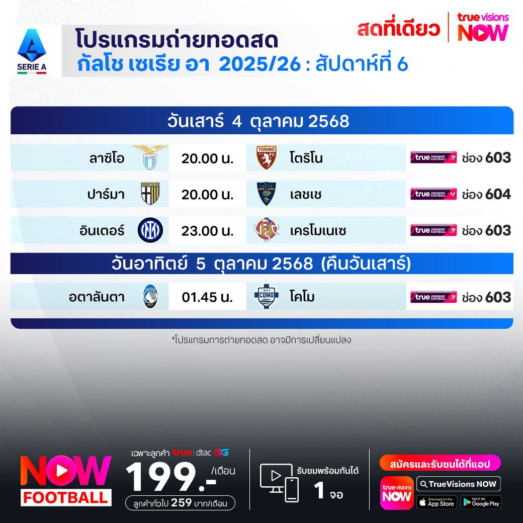 Atalanta vs Como เวลา 01.45-03.45 ทางช่องTPF 3(603)
