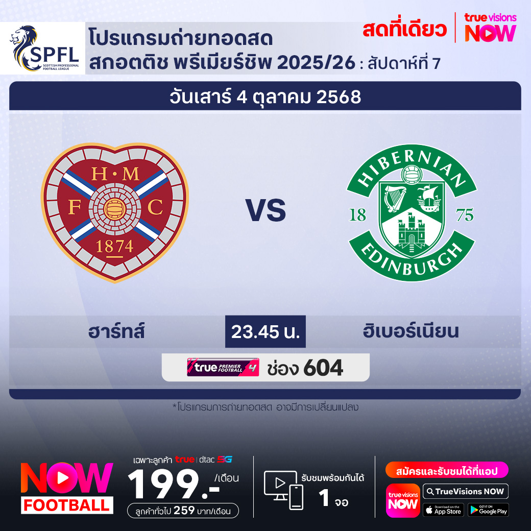 Heart of Midlothian vs Hibernian เวลา 23.45-01.45 ทางช่อง TPF 4 (604)