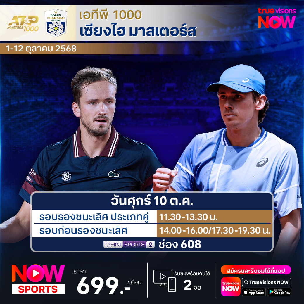 วันนี้มีอะไรดูที่ ทรูวิชั่นส์ ประจำวันศุกร์ที่ 10 ตุลาคม 68 ยังคงมีกีฬาที่น่าสนใจให้ได้ตามลุ้นตามเชียร์กันเหมือนเดิม โดยในส่วนของเทนนิสยังมีศึกเทนนิส เอทีพี ทัวร์ รายการ เซี่ยงไฮ้ มาสเตอร์ส และ เทนนิสหญิง ดับเบิ้ลยูทีเอ ทัวร์ รายการ อู่ฮั่น โอเพ่น ให้ได้ตามเชียร์กันต่อเนื่อง นอกจากนี้ยังมีกอล์ฟ พีจีเอ ทัวร์ รายการ บายเคอร์เรนท์ คลาสสิก, ดีพี เวิลด์ ทัวร์ รายการ สแปนิช โอเพ่น, พีจีเอ ทัวร์ แชมเปี้ยนส์ รายการ เอสเอเอส แชมเปี้ยนชิพ, แอลพีจีเอ ทัวร์ รายการ บิวอิก แอลพีจีเอ เซี่ยงไฮ้, เวิลด์ สนุกเกอร์ ทัวร์ รายการ ซีอาน กรังด์ปรีซ์, แบดมินตัน บีดับเบิ้ลยูเอฟ รายการ อาร์คติก โอเพ่น และ เมเจอร์ ลีก เบสบอล งานนี้ ทรูวิชั่นส์ จัดเต็มให้ชมกันถึงบ้าน