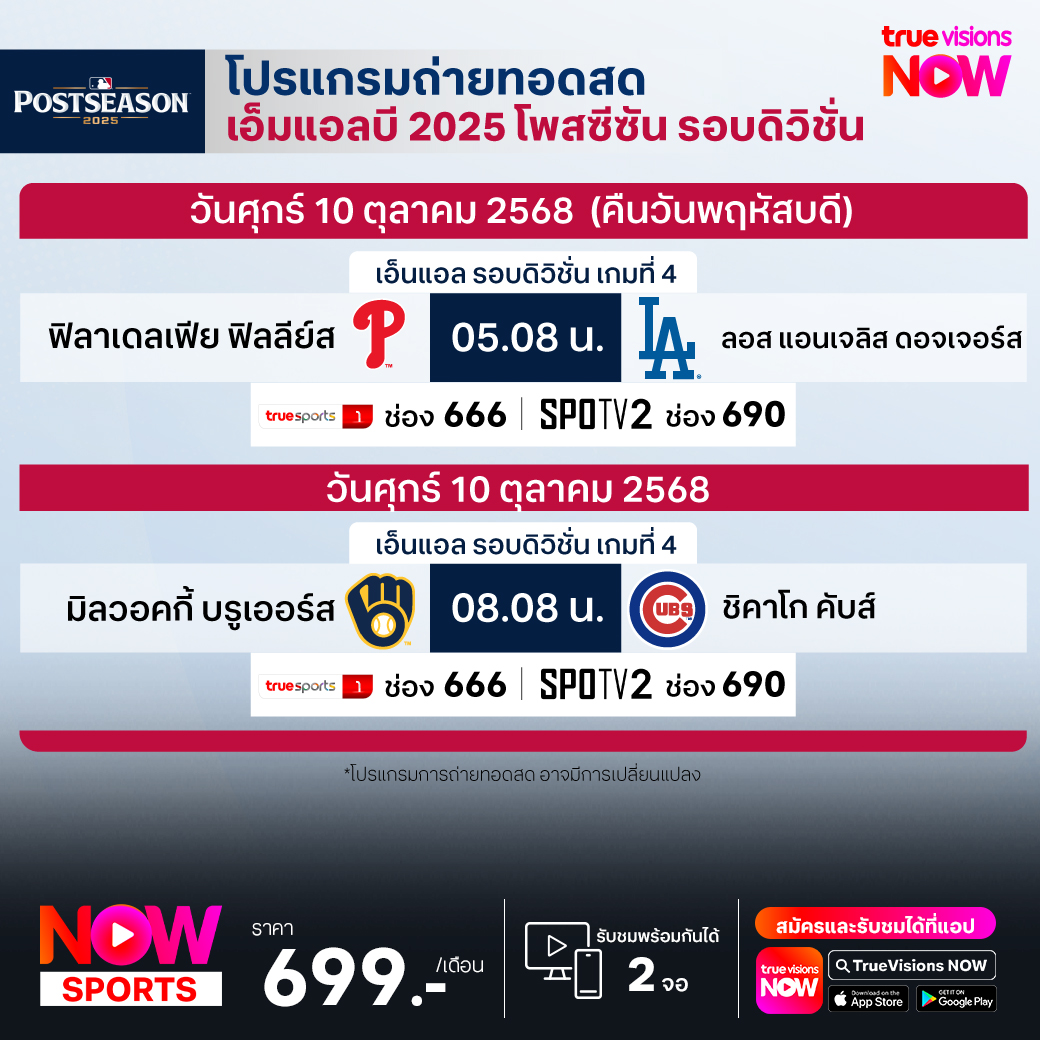 ฟิลาเดลเฟีย ฟิลลี่ย์ส พบ แอลเอ ด็อดเจอร์ส เวลา 05.08 น. ทางช่อง True Sports 1 (ช่อง 666) / SPOTV 2 (ช่อง 690)