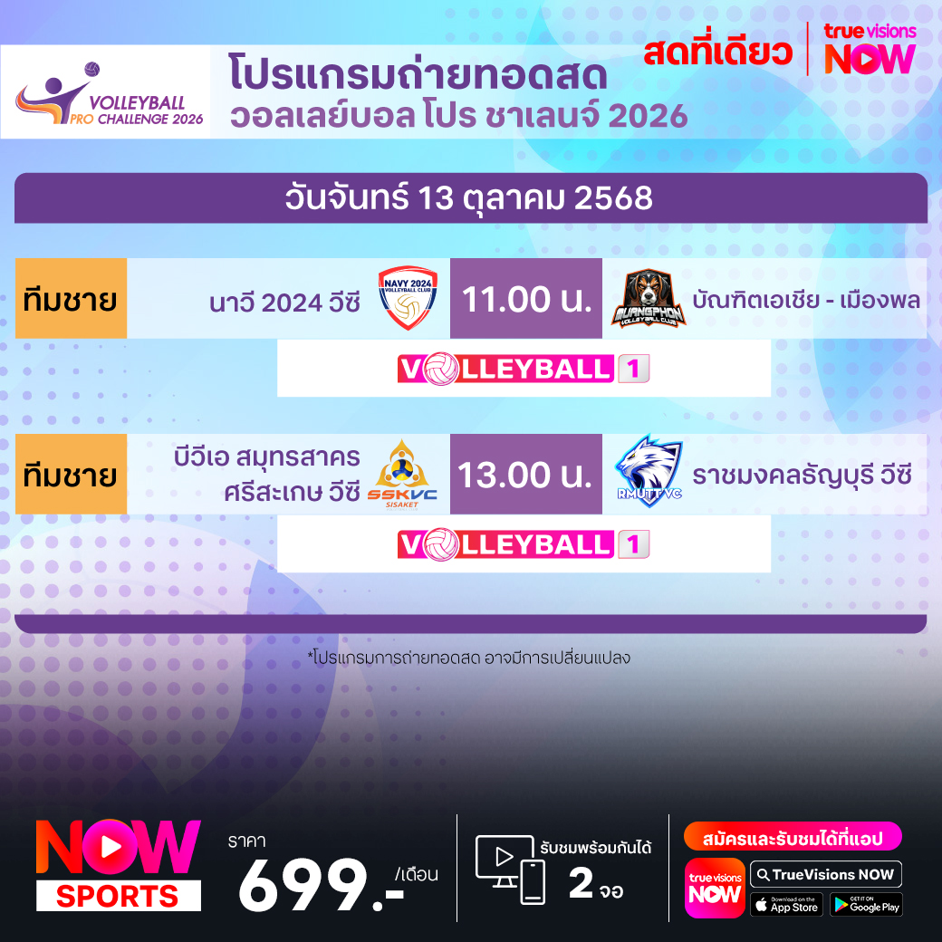 บีวีเอ สมุทรสาคร ศรีสะเกษ วีซี พบ ราชมงคลธัญบุรี วีซี เวลา 13.00 ทางช่อง Volleyball 1