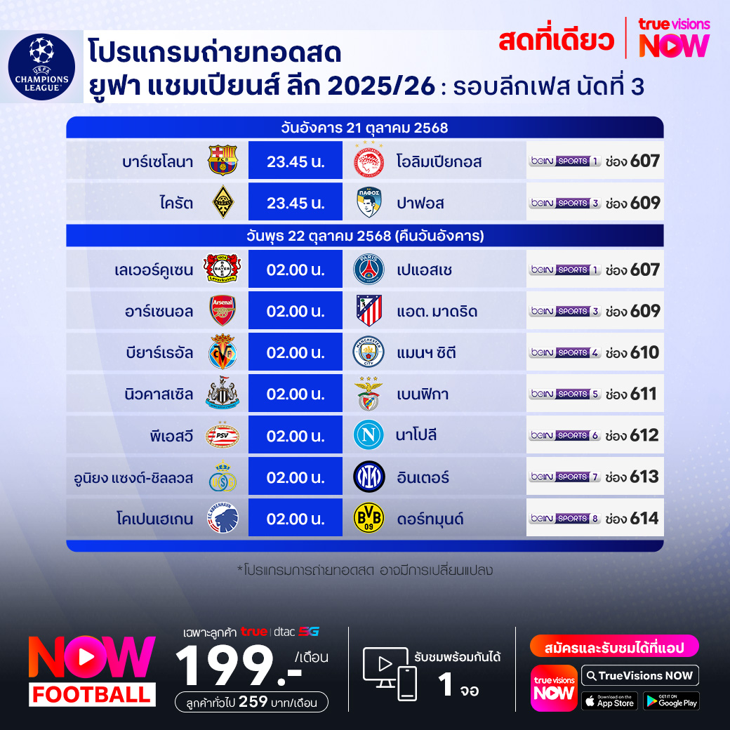 วันนี้มีอะไรดูที่ ทรูวิชั่นส์ ประจำวันอังคารที่ 21 ตุลาคม 68 ยังคงมีกีฬาที่น่าสนใจให้ได้ตามลุ้นตามเชียร์กันเหมือนเดิม โดยในส่วนของฟุตบอลนั้นยังมีศึก ยูฟ่า แชมเปี้ยนส์ ลีก รอบ ลีก เฟส นัดที่สาม ให้ได้ตามเชียร์กันต่อ ส่วนกีฬาอื่นๆ ยังมีเทนนิส เอทีพี ทัวร์ รายการ เวียนนา โอเพ่น, ดับเบิ้ลยูทีเอ ทัวร์ รายการ แปซิฟิก โอเพ่น และ เวิลด์ สนุกเกอร์ ทัวร์ รายการ นอร์ธเทิร์น ไอร์แลนด์ โอเพ่น งานนี้ ทรูวิชั่นส์ จัดเต็มให้ชมกันถึงบ้าน