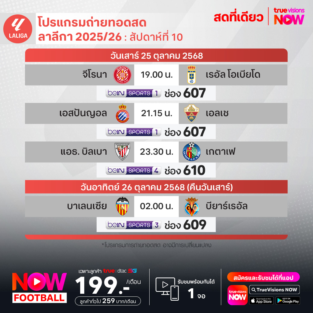 วันนี้มีอะไรดูที่ ทรูวิชั่นส์ ประจำวันเสาร์ที่ 25 ตุลาคม 68 ยังคงมีกีฬาที่น่าสนใจให้ได้ตามลุ้นตามเชียร์กันเหมือนเดิม โดยในส่วนของฟุตบอลนั้นยังมีศึก ลา ลีกา สเปน, บุนเดสลีกา เยอรมนี, กัลโช่ เซเรีย อา อิตาลี, ลีกา 2 เยอรมนี และ ซาอุดิ โปร ลีก ให้ได้ตามเชียร์กันต่อ ส่วนกีฬาอื่นๆ คอมอเตอร์สปอร์ตพลาดไม่ได้กับศึก ฟอร์มูล่า วัน รายการ กรังด์ปรีซ์ ออฟ เม็กซิโก และ โมโต จีพี รายการ กรังด์ปรีซ์ ออฟ มาเลเซีย นอกจากนี้ยังมีเทนนิส เอทีพี ทัวร์ รายการ เวียนนา โอเพ่น, ดับเบิ้ลยูทีเอ ทัวร์ รายการ แปซิฟิก โอเพ่น, กอล์ฟ พีจีเอ ทัวร์ รายการ แบงค์ ออฟ ยูท่าห์ แชมเปี้ยนชิพ, แอลพีจีเอ ทัวร์ รายการ อินเตอร์เนชั่นแนล คราวน์, เวิลด์ สนุกเกอร์ ทัวร์ รายการ นอร์ธเทิร์น ไอร์แลนด์ โอเพ่น, แบดมินตัน บีดับเบิ้ลยูเอฟ รายการ เฟร้นช์ โอเพ่น, เมเจอร์ ลีก เบสบอล เวิลด์ ซีรี่ส์, ยูเอฟซี 321, วอลเลย์บอล วี-ลีก และ ฟุตซอลไทยลีก งานนี้ ทรูวิชั่นส์ จัดเต็มให้ชมกันถึงบ้าน