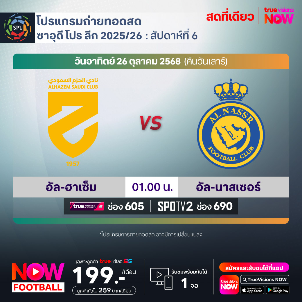 Al-Hazem vs Al-Nassr เวลา 01.00-03.00 ทางช่องTPF 5(605) / SPOTV2 (690)