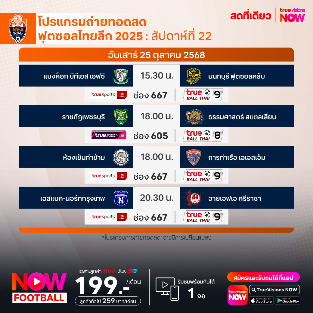แบงค็อก บีทีเอส เอฟซี พบ นนทบุรี ฟุตซอลคลับ เวลา 15.30 ทางช่อง TS 2 (667) / True Ball Thai 9 (NOW)