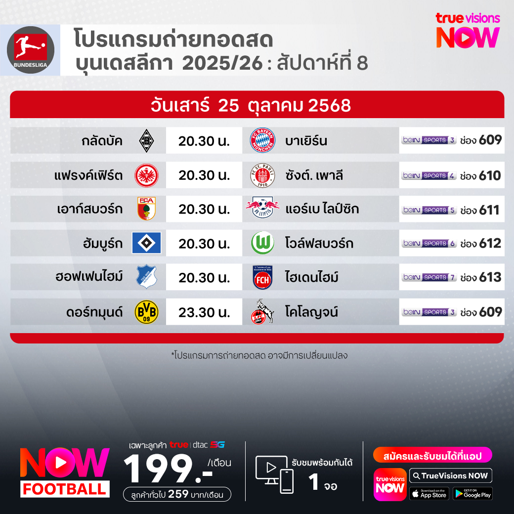 Monchengladbach vs Bayern เวลา 20.30-22.30 ทางช่อง beIN 3 (609)