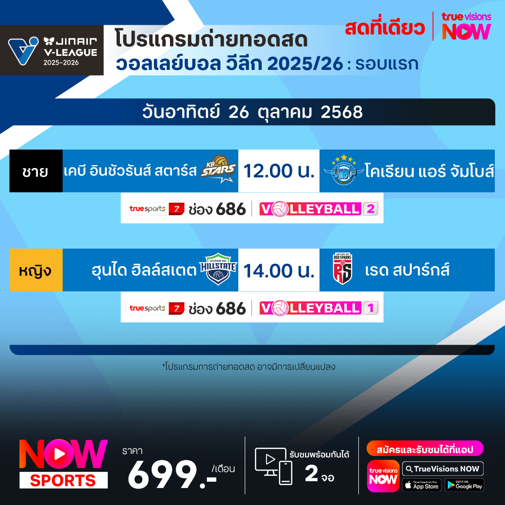 เคบี อินชัวรันส์ สตาร์ส พบ โคเรียน แอร์ จัมโบส์ เวลา 12.00 ทางช่อง TS 7 (686) / Volleyball 2