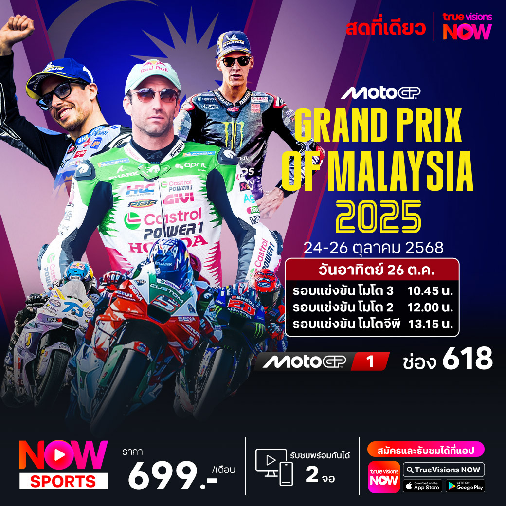 ศึก โมโต จีพี เวิลด์ แชมเปี้ยนชิพ การแข่งขันจักรยานยนต์ทางเรียบชิงแชมป์โลกอันดับ 1 ตลอดกาล เดินทางมาถึงสนามที่ 20 ของฤดูกาลแล้ว สั่งลาทวีปเอเชียกันด้วยรายการ กรังด์ปรีซ์ ออฟ มาเลเซีย ที่สนาม เซปัง อินเตอร์เนชั่นแนล เซอร์กิต กรุงกัวลาลัมเปอร์ ประเทศมาเลเซีย ชมสด ครบทุกช่วงการแข่งขันทั้ง 3 รุ่น ทั้ง โมโต 3, โมโต 2 และ โมโต จีพี เอ็กซ์คลูซีฟ ที่ ทรูวิชั่นส์
