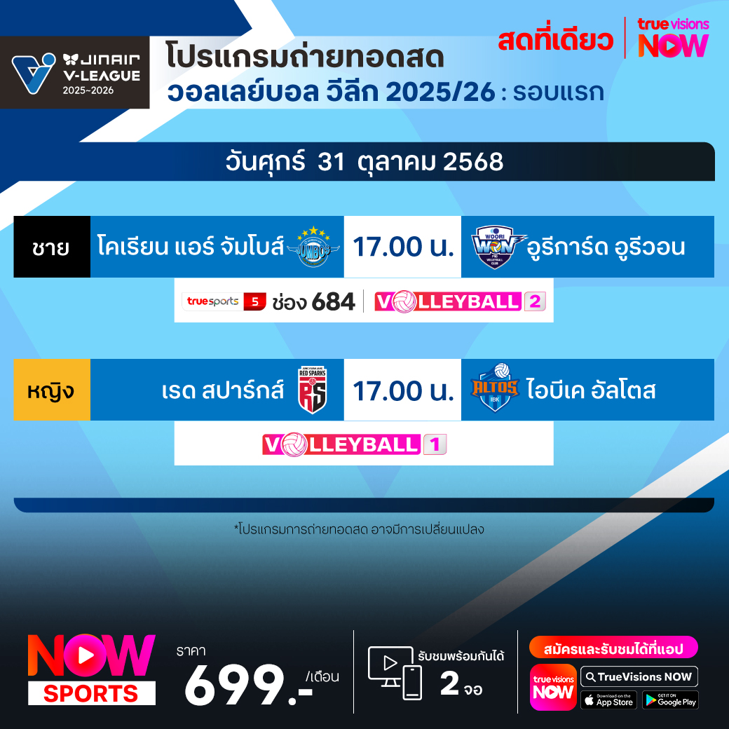 วันนี้มีอะไรดูที่ ทรูวิชั่นส์ ประจำวันศุกร์ที่ 31 ตุลาคม 68 ยังคงมีกีฬาที่น่าสนใจให้ได้ตามลุ้นตามเชียร์กันเหมือนเดิม โดยในส่วนของฟุตบอลนั้นยังมีศึก ลา ลีกา สเปน, บุนเดสลีกา เยอรมนี, ลีกา 2 เยอรมนี, เอ-ลีก ออสเตรเลีย และ ซาอุดิ โปร ลีก ให้ได้ตามเชียร์กันต่อ ส่วนกีฬาอื่นๆ ยังมีเทนนิส เอทีพี ทัวร์ รายการ ปารีส มาสเตอร์ส, กอล์ฟ แอลพีจีเอ ทัวร์ รายการ เมย์แบงค์ แชมเปี้ยนชิพ, แบดมินตัน บีดับเบิ้ลยูเอฟ รายการ ไฮโล โอเพ่น, เมเจอร์ ลีก เบสบอล เวิลด์ ซีรี่ส์ และ วอลเลย์บอล วี-ลีก งานนี้ ทรูวิชั่นส์ จัดเต็มให้ชมกันถึงบ้าน