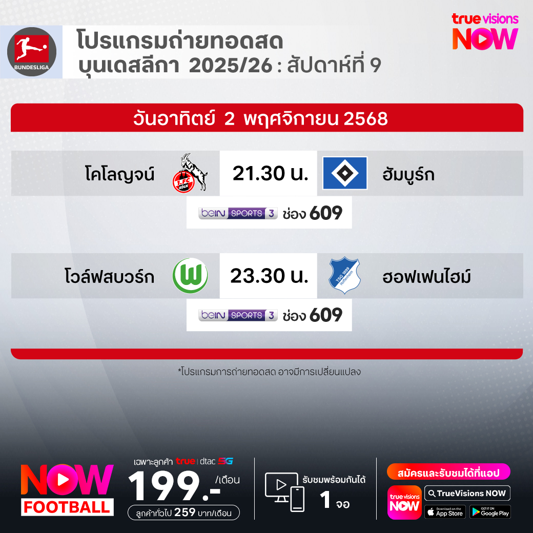 Cologne vs Hamburg เวลา 21.30-23.30 ทางช่อง beIN 3 (609)