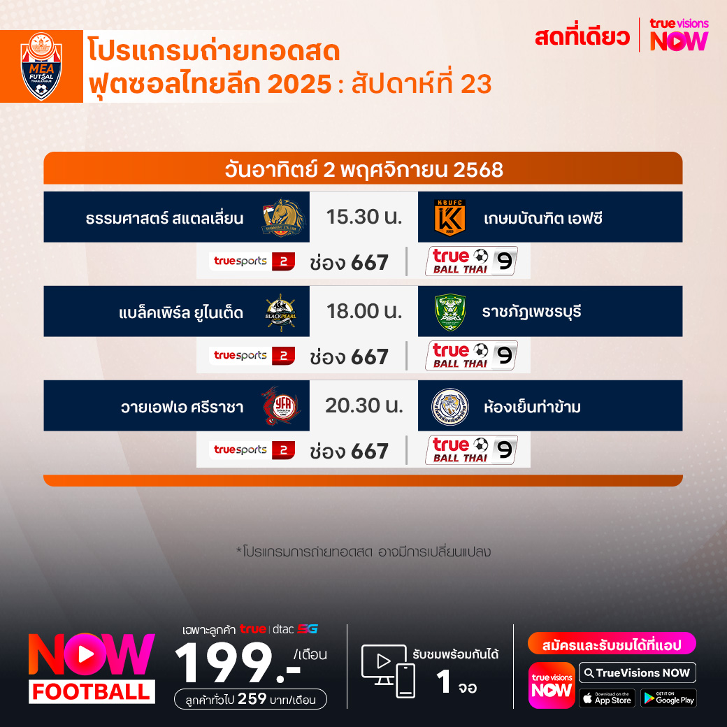 ธรรมศาสตร์ สแตลเลี่ยน พบ เกษมบัณฑิต เอฟซี เวลา 15.30 ทางช่อง TS 2 (667) / True Ball Thai 9 (NOW)