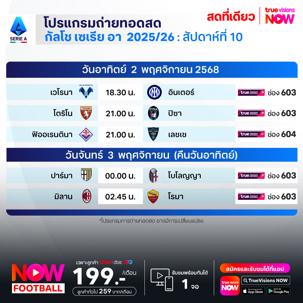 วันนี้มีอะไรดูที่ ทรูวิชั่นส์ ประจำวันอาทิตย์ที่ 2 พฤศจิกายน 68 ยังคงมีกีฬาที่น่าสนใจให้ได้ตามลุ้นตามเชียร์กันเหมือนเดิม โดยในส่วนของฟุตบอลนั้นยังมีศึก ลา ลีกา สเปน, บุนเดสลีกา เยอรมนี, กัลโช่ เซเรีย อา อิตาลี และ สกอตติช พรีเมียร์ สปอร์ตส์ คัพ ให้ได้ตามเชียร์กันต่อ ส่วนกีฬาอื่นๆ ยังมีเทนนิส เอทีพี ทัวร์ รายการ ปารีส มาสเตอร์ส, เทนนิสหญิง ดับเบิ้ลยูทีเอ ไฟนอลส์, กอล์ฟ แอลพีจีเอ ทัวร์ รายการ เมย์แบงค์ แชมเปี้ยนชิพ, เวิลด์ สนุกเกอร์ ทัวร์ รายการ อินเตอร์เนชั่นแนล แชมเปี้ยนชิพ, แบดมินตัน บีดับเบิ้ลยูเอฟ รายการ ไฮโล โอเพ่น, วอลเลย์บอล วี-ลีก และ ฟุตซอลไทยลีก งานนี้ ทรูวิชั่นส์ จัดเต็มให้ชมกันถึงบ้าน
