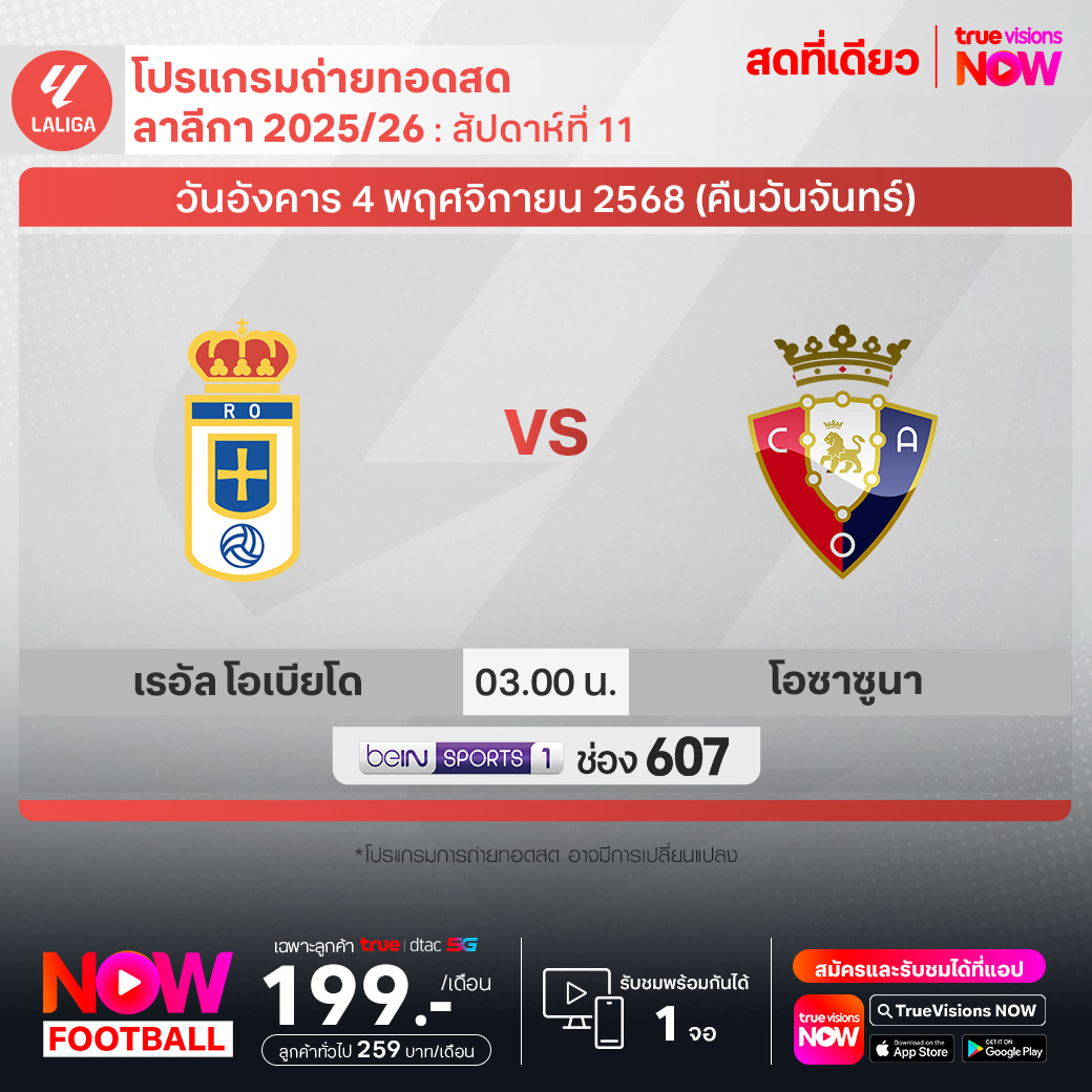 Real Oviedo vs Osasuna เวลา 03.00-05.00 ทางช่อง beIN 1 (607)