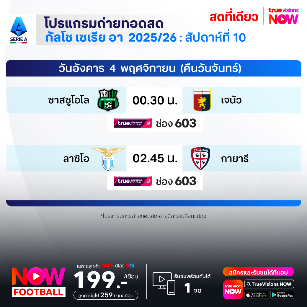 Sassuolo vs Genoa เวลา 00.30-02.30 ทางช่องTPF 3(603)
