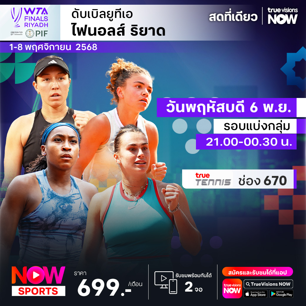 เทนนิสหญิงรายการใหญ่ส่งท้ายปี ดับเบิ้ลยูทีเอ ไฟนอลส์ รายการที่รวมนักเทนนิสหญิงที่ดีที่สุด 8 คนของโลกในปี 2025 มาแข่งขัน เพื่อหาสุดยอดนักเทนนิสหญิงประจำปี 2025 ที่เมืองริยาดห์ ประเทศซาอุดิอาระเบีย โดยแชมป์เก่าในปีที่ผ่านมาคือ โคโค กอฟฟ์ ยอดนักเทนนิสหญิงชาวอเมริกัน และในปีนี้เธอได้สิทธิ์ป้องกันแชมป์ด้วย ร่วมลุ้นกันว่าใครจะคว้าแชมป์รายการใหญ่ รายการสุดท้ายไปครอง ชมสด ครบทุกรอบ ที่ ทรูวิชั่นส์