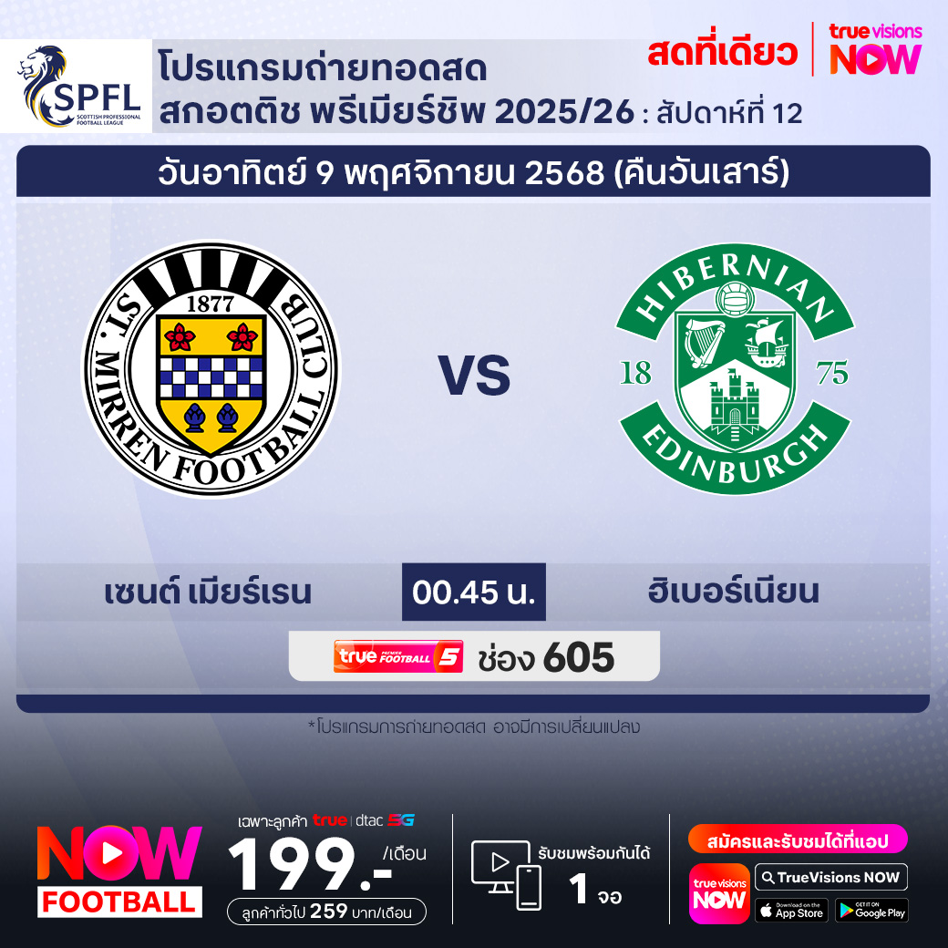 St. Mirren vs Hibernian เวลา 00.45-02.45 ทางช่องTPF 5(605)
