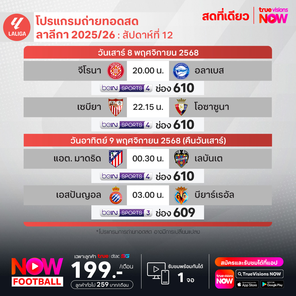 Atletico Madrid vs Levante เวลา 00.30-02.30 ทางช่อง beIN 4 (610)