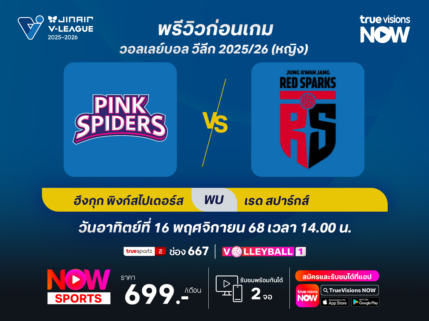 พรีวิว : วอลเลย์บอล วีลีก 2025/26 อินชอน ฮึงกุก ไลฟ์ พิงก์สไปเดอร์ส พบกับ แทจอน จองกวานจัง เรดสปาร์กส์ สนาม : อินชอน ซัมซาน เวิลด์ ยิมเนเซียม (เมืองอินชอน) เวลา 14.10 น. วันอาทิตย์ที่ 16 พฤศจิกายน 2568