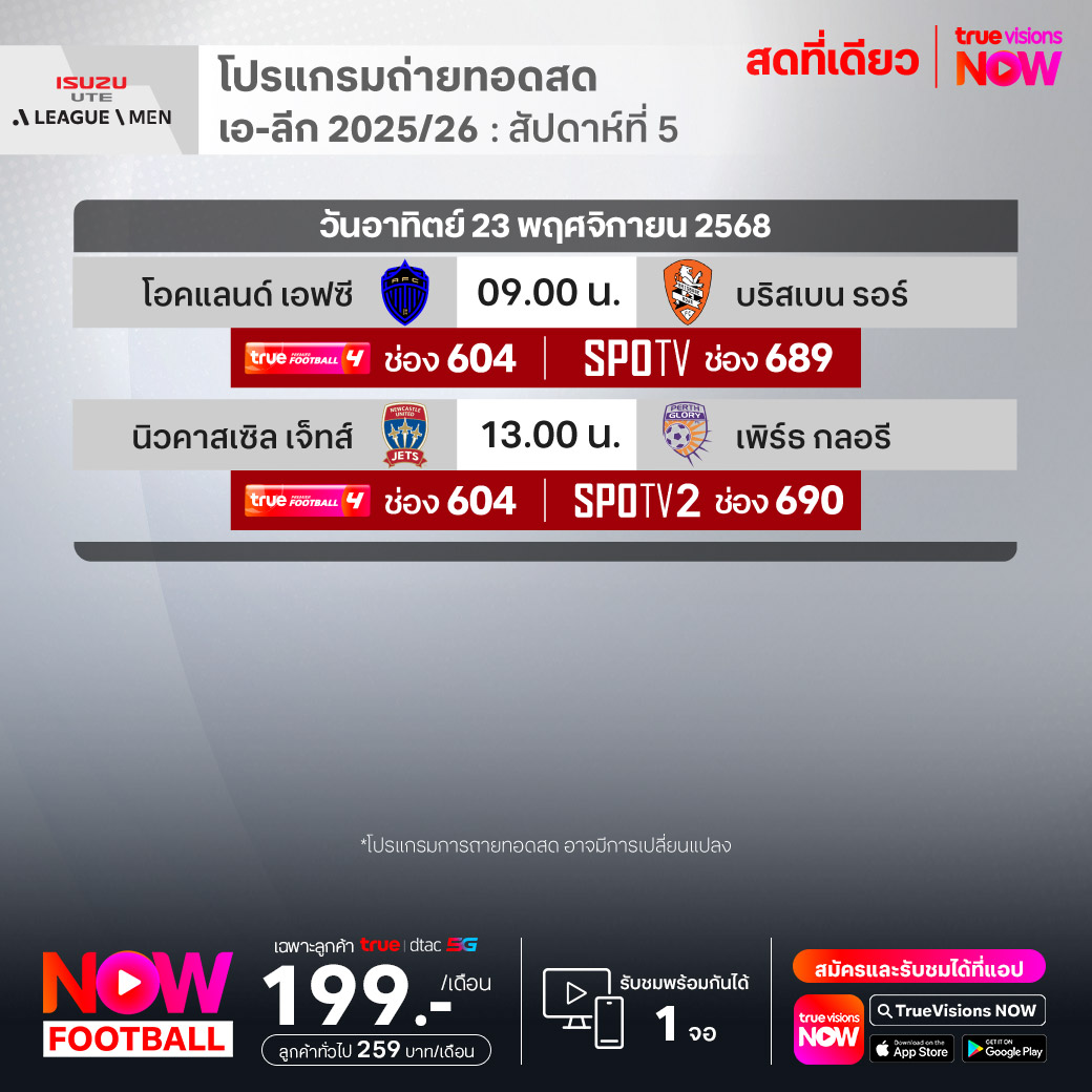 Auckland FC vs Brisbane Roar FC เวลา 09.00-11.00 ทางช่องTPF 4(604) / SPOTV (689)