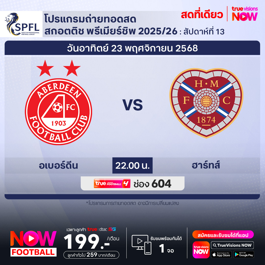 Aberdeen vs Heart of Midlothian เวลา 22.00-00.00 ทางช่องTPF 4(604)