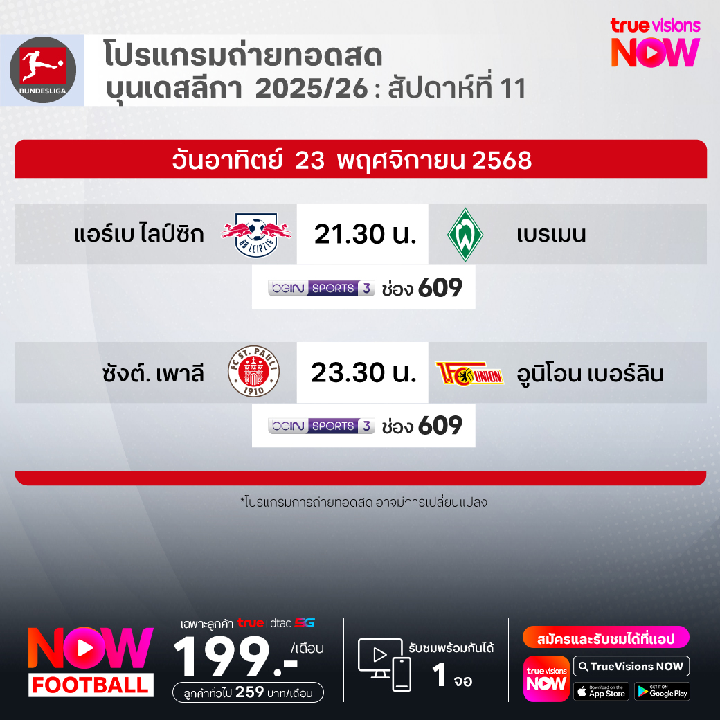 Leipzig vs Werder Bremen เวลา 21.30-23.30 ทางช่อง beIN 3 (609)
