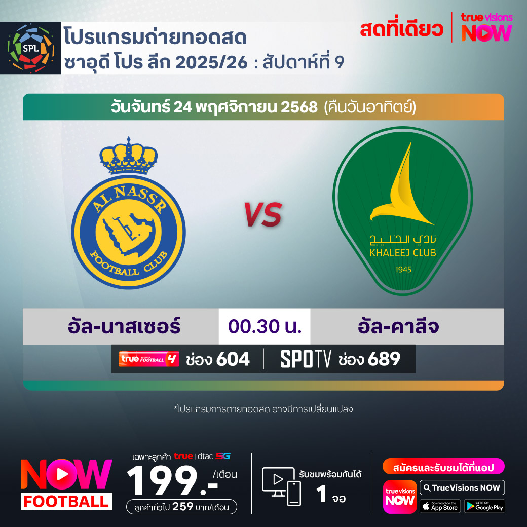 Al Nassr vs Al Khaleej เวลา 00.30-02.30 ทางช่องTPF 4(604) / SPOTV (689)