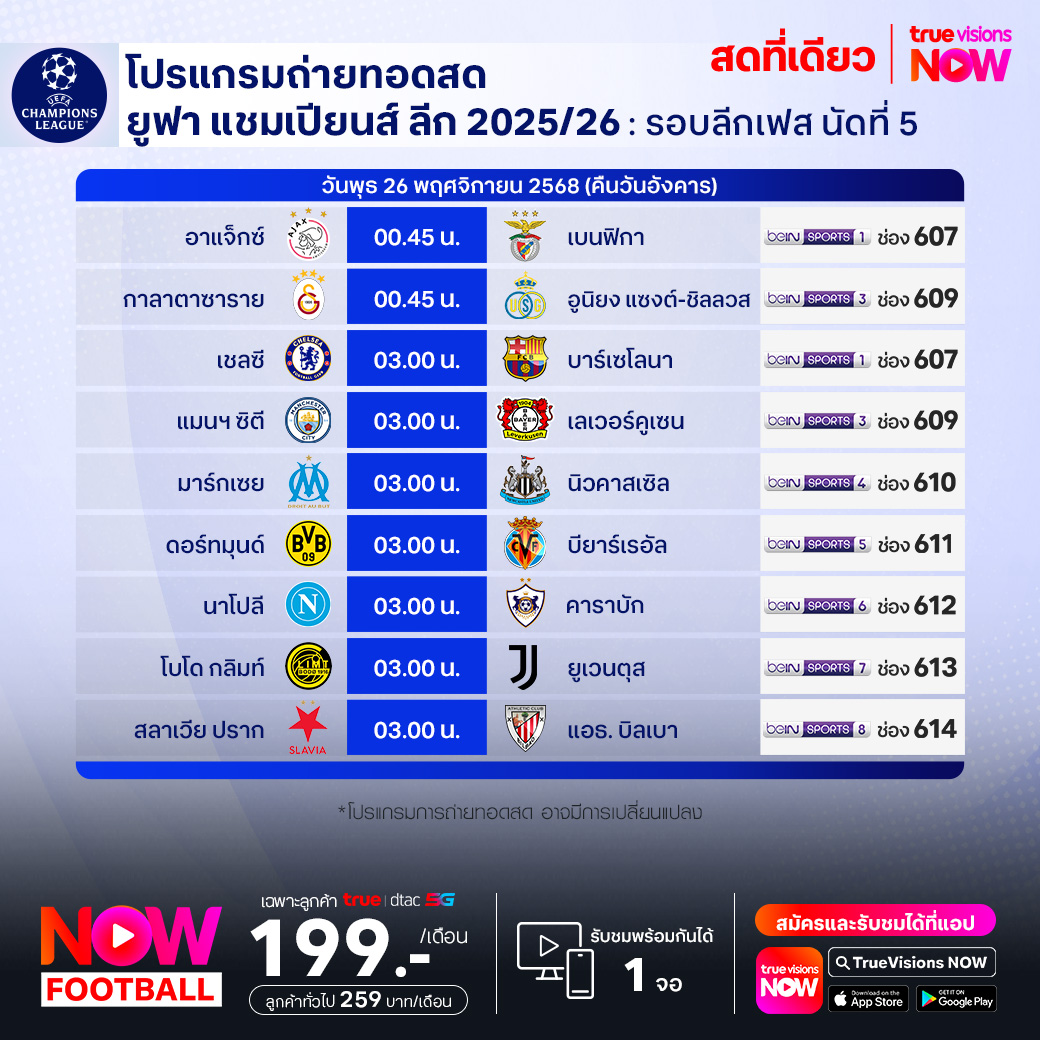 วันนี้มีอะไรดูที่ ทรูวิชั่นส์ ประจำวันอังคารที่ 25 พฤศจิกายน 68 ยังคงมีกีฬาที่น่าสนใจให้ได้ตามลุ้นตามเชียร์กันเหมือนเดิม โดยในส่วนของฟุตบอลนั้นยังมีศึก ยูฟ่า แชมเปี้ยนส์ ลีก ให้ได้ตามเชียร์กันต่อ ส่วนกีฬาอื่นๆ ยังมี วอลเลย์บอล วี-ลีก งานนี้ ทรูวิชั่นส์ จัดเต็มให้ชมกันถึงบ้าน