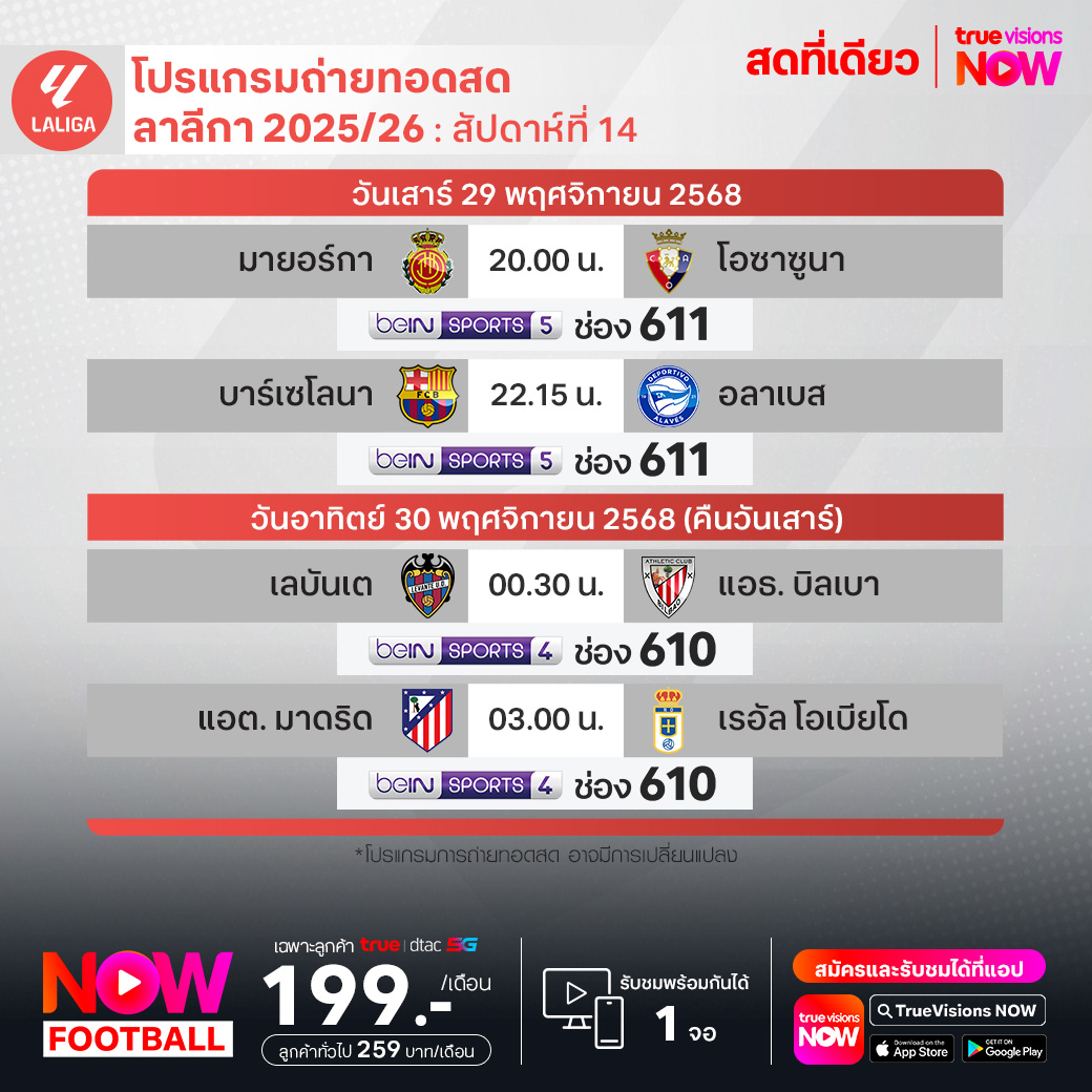 Mallorca vs Osasuna เวลา 20.00-22.00 ทางช่อง beIN 5 (611)