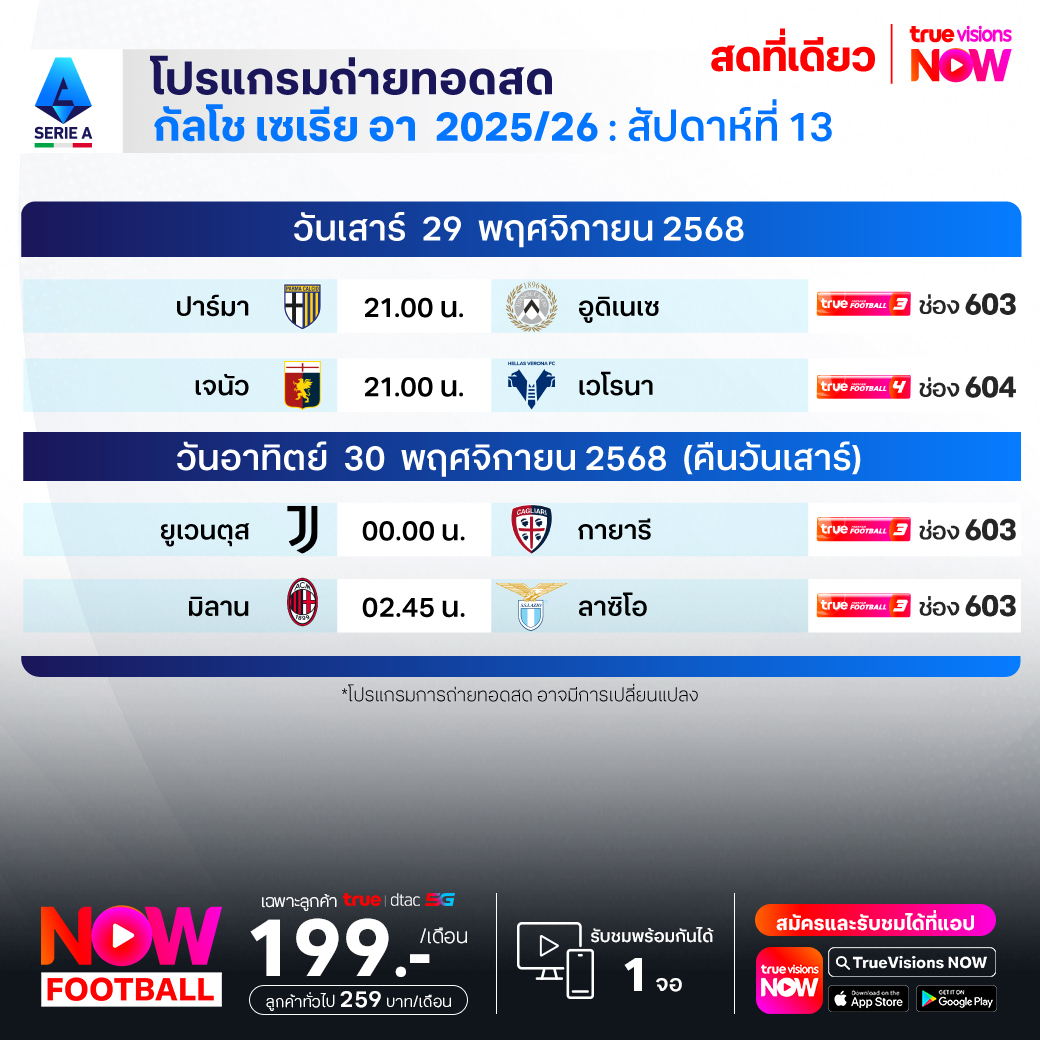 วันนี้มีอะไรดูที่ ทรูวิชั่นส์ ประจำวันเสาร์ที่ 29 พฤศจิกายน 68 ยังคงมีกีฬาที่น่าสนใจให้ได้ตามลุ้นตามเชียร์กันเหมือนเดิม โดยในส่วนของฟุตบอลนั้นยังมีศึก ลา ลีกา สเปน, บุนเดสลีกา เยอรมนี, กัลโช่ เซเรีย อา อิตาลี, สกอตติช พรีเมียร์ชิพ, เอ-ลีก ออสเตรเลีย และ ซาอุดิ คิงส์ คัพ ให้ได้ตามเชียร์กันต่อ ส่วนกีฬาอื่นๆ ยังมีศึก ฟอร์มูล่า วัน รายการ กาตาร์ กรังด์ปรีซ์, ฟอร์มูล่า ทู รายการ โลเซล กาตาร์, กอล์ฟ ดีพี เวิลด์ ทัวร์ รายการ บีเอ็มดับเบิ้ลยู ออสเตรเลียน พีจีเอ แชมเปี้ยนชิพ, เวิลด์ สนุกเกอร์ ทัวร์ รายการ ยูเค แชมเปี้ยนชิพ, แบดมินตัน บีดับเบิ้ลยูเอฟ รายการ อินเดีย อินเตอร์เนชั่นแนล และ วอลเลย์บอล วี-ลีก งานนี้ ทรูวิชั่นส์ จัดเต็มให้ชมกันถึงบ้าน