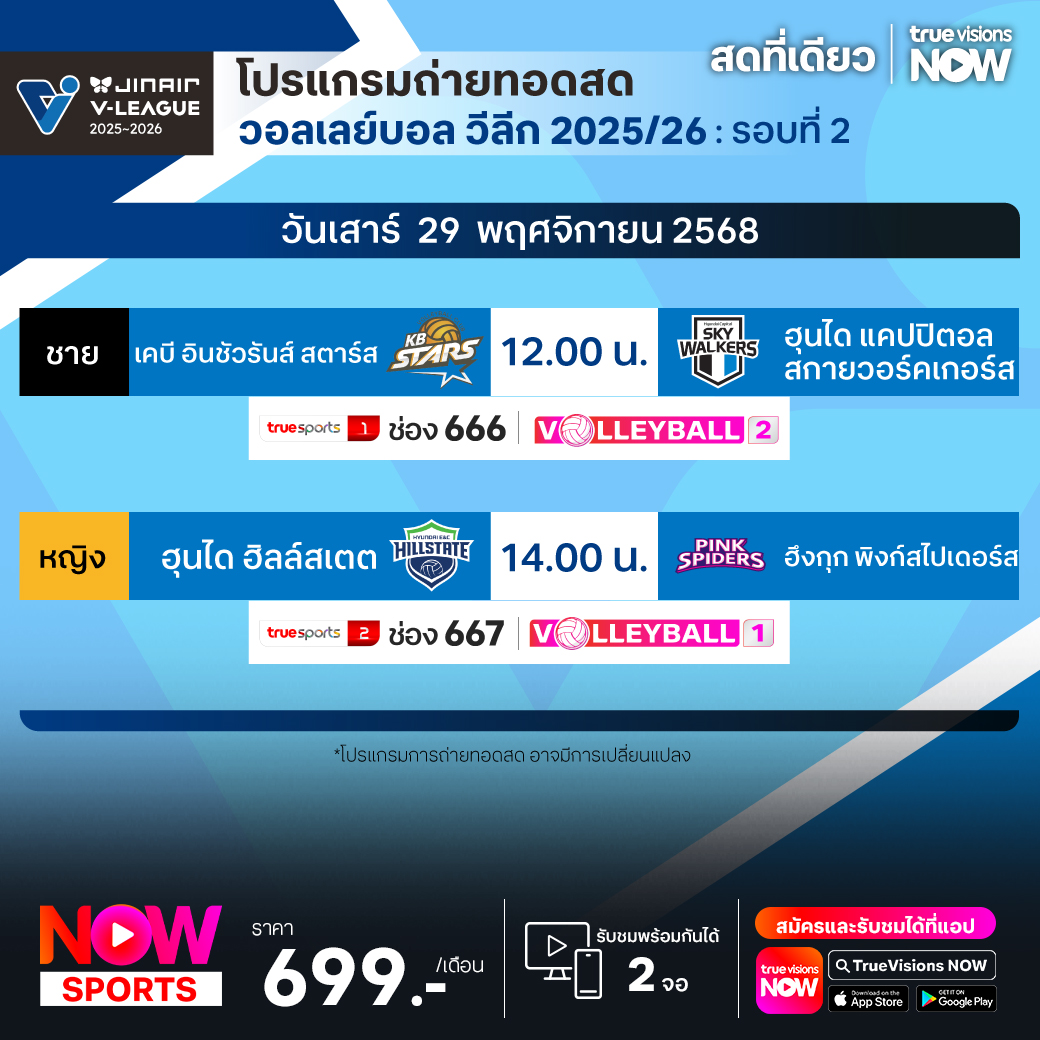 เคบี อินชัวรันส์ สตาร์ส พบ ฮุนได แคปปิตอล สกายวอร์คเกอร์ส เวลา 12.00 ทางช่อง TS 1 (666) / Volleyball 2