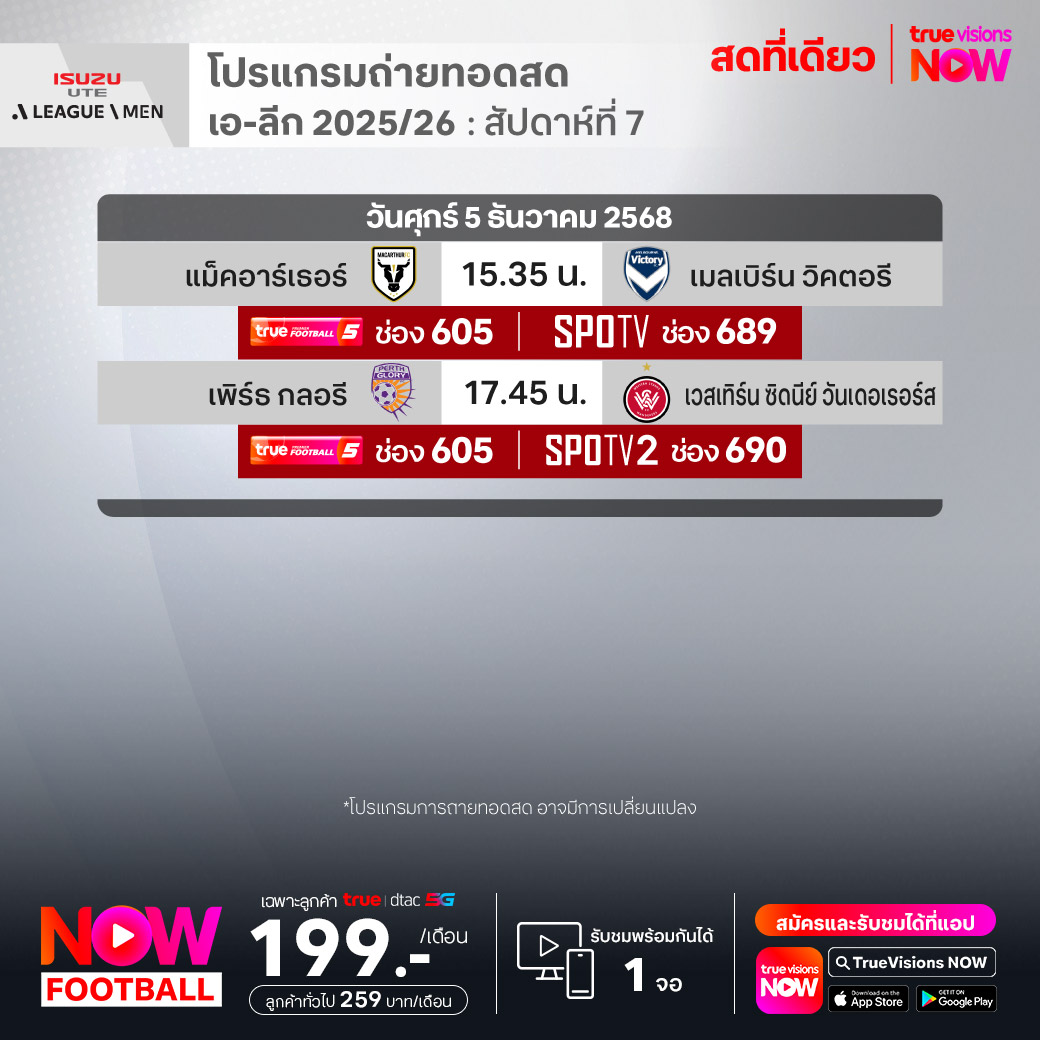 Macarthur FC vs Melbourne Victory เวลา 15.35-17.35 ทางช่องTPF 5(605)/SPOTV (689)