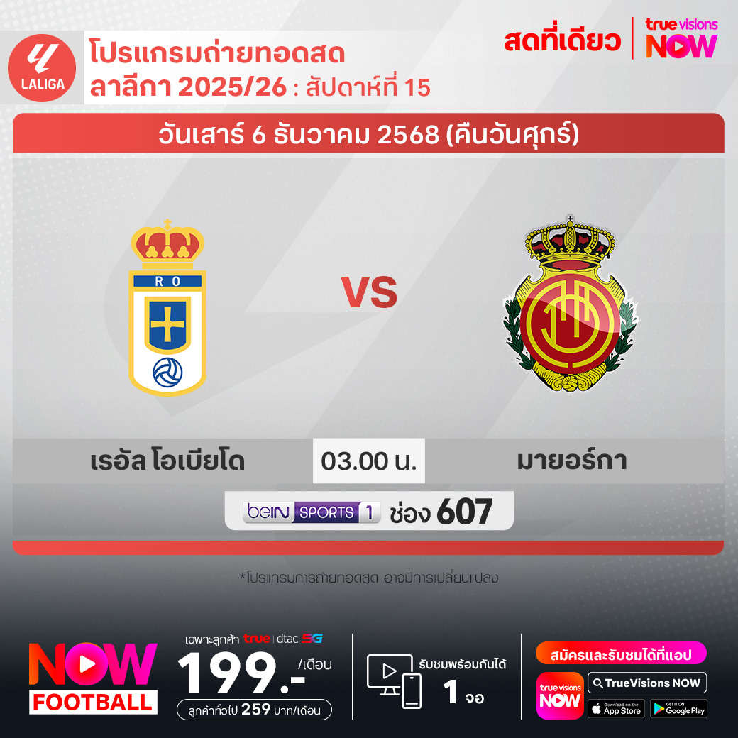 Real Oviedo vs Mallorca เวลา 03.00-05.00 ทางช่อง beIN 1 (607)