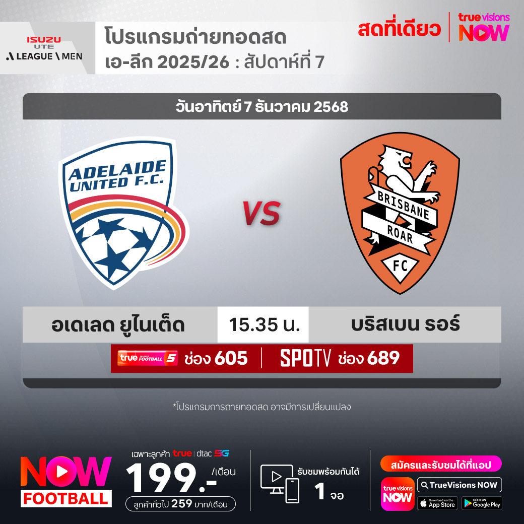 Adelaide United vs Brisbane Roar FC เวลา 15.35-17.35 ทางช่องTPF 5(605)/SPOTV (689)