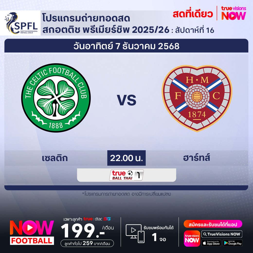 Celtic vs Heart of Midlothian เวลา 22.00-00.00 ทางช่อง True Ball Thai 1