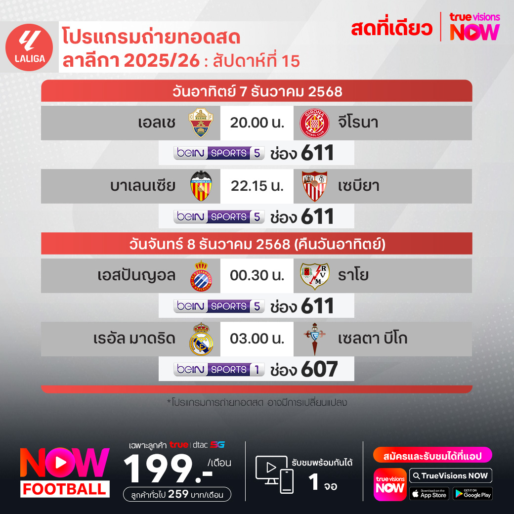 วันนี้มีอะไรดูที่ ทรูวิชั่นส์ ประจำวันอาทิตย์ที่ 7 ธันวาคม 68 ยังคงมีกีฬาที่น่าสนใจให้ได้ตามลุ้นตามเชียร์กันเหมือนเดิม โดยในส่วนของฟุตบอลนั้นยังมีศึก ลา ลีกา สเปน, บุนเดสลีกา เยอรมนี, กัลโช่ เซเรีย อา อิตาลี, สกอตติช พรีเมียร์ชิพ และ เอ-ลีก ออสเตรเลีย ให้ได้ตามเชียร์กันต่อ ส่วนคอมอเตอร์สปอร์ต พลาดไม่ได้กับศึก ฟอร์มูล่า วัน รายการ อาบูดาบี กรังด์ปรีซ์ และ ฟอร์มูล่า ทู แชมเปี้ยนชิพ ยาส มาริน่า อาบูดาบี ขณะที่การแข่งขันซีเกมส์ มี ฟุตบอลหญิง และ แบดมินตัน ให้ได้ตามเชียร์กัน ส่วนกีฬาอื่นๆ ยังมี กอล์ฟ พีจีเอ ทัวร์ รายการ ฮีโร่ เวิลด์ ชาลเลนจ์, ดีพี เวิลด์ ทัวร์ รายการ คราวน์ ออสเตรเลียน โอเพ่น และรายการ เนดแบงค์ กอล์ฟ ชาลเลนจ์, เวิลด์ สนุกเกอร์ ทัวร์ รายการ ยูเค แชมเปี้ยนชิพ, ศึก ยูเอฟซี 323, ศึก เวิลด์ บ็อกซิ่ง และ วอลเลย์บอล วี-ลีก งานนี้ ทรูวิชั่นส์ จัดเต็มให้ชมกันถึงบ้าน