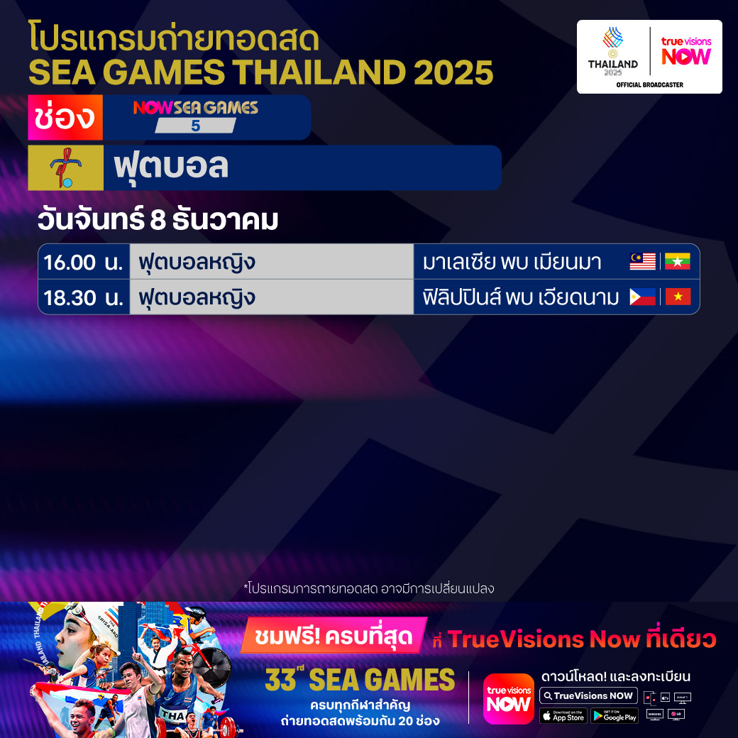 วันนี้มีอะไรดูที่ ทรูวิชั่นส์ ประจำวันจันทร์ที่ 8 ธันวาคม 68 ยังคงมีกีฬาที่น่าสนใจให้ได้ตามลุ้นตามเชียร์กันเหมือนเดิม โดยในส่วนของฟุตบอลนั้นยังมีศึก ลา ลีกา สเปน และ กัลโช่ เซเรีย อา อิตาลี ให้ได้ตามเชียร์กันต่อ ส่วนกีฬาซีเกมส์ 2025 ยังมีถ่ายทอดสดอีกหลายชนิดกีฬาให้ได้ติดตาม ไม่ว่าจะเป็น ฟุตบอลชาย, ฟุตบอลหญิง และ แบดมินตัน ทีมชาย-หญิง งานนี้ ทรูวิชั่นส์ จัดเต็มให้ชมกันถึงบ้าน