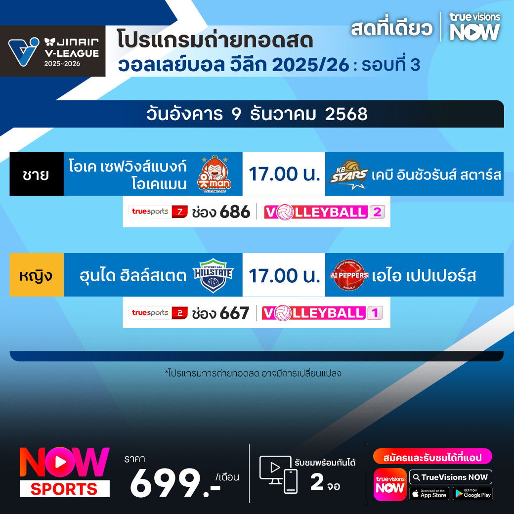 โอเค เซฟวิงส์แบงก์ โอเคแมน พบ เคบี อินชัวรันส์ สตาร์ส เวลา 17.00 ทางช่อง TS 7 (686) / Volleyball 2