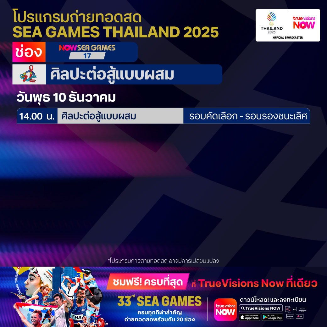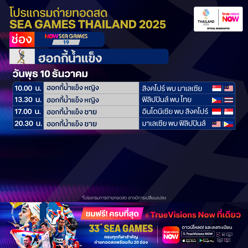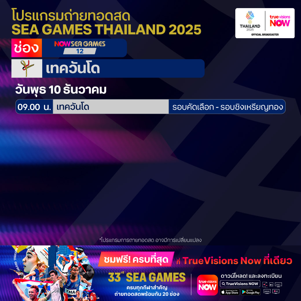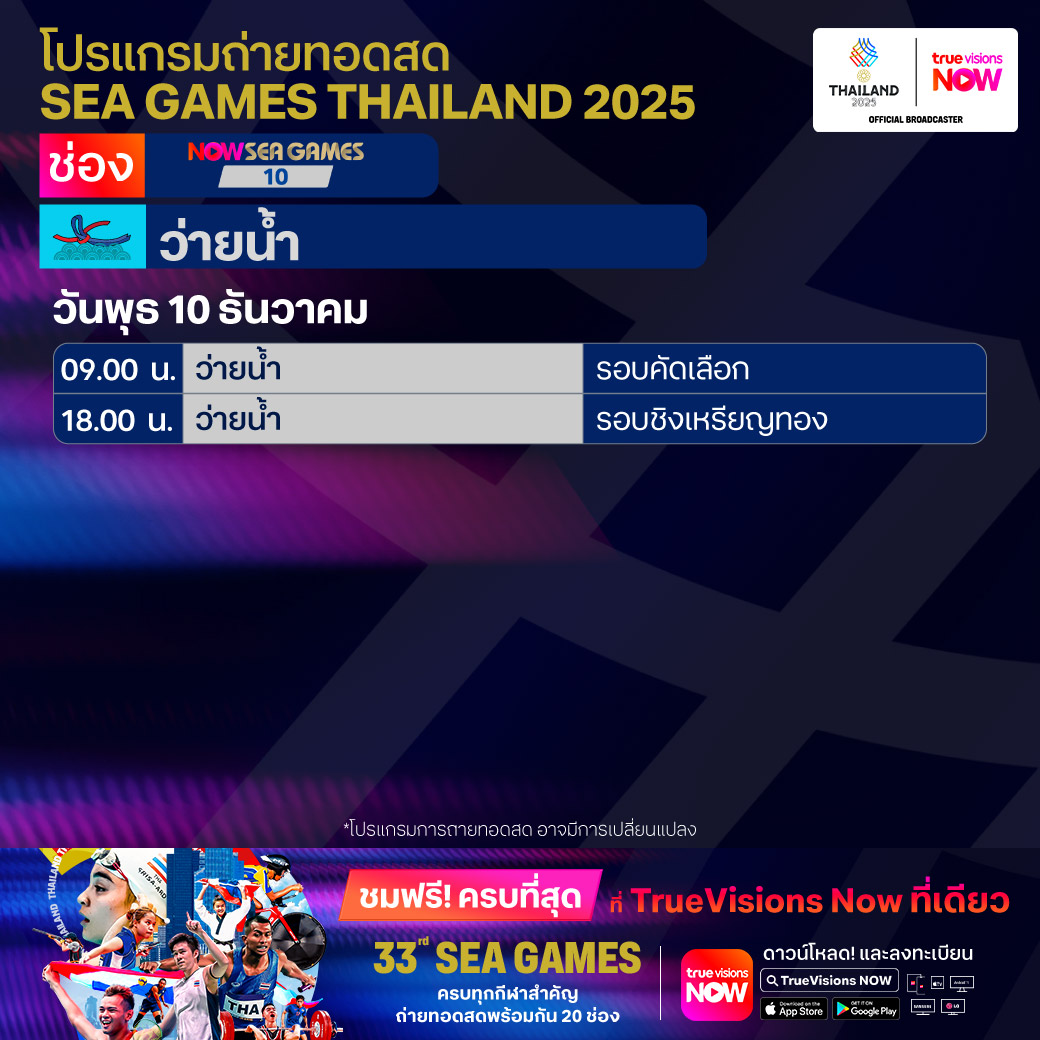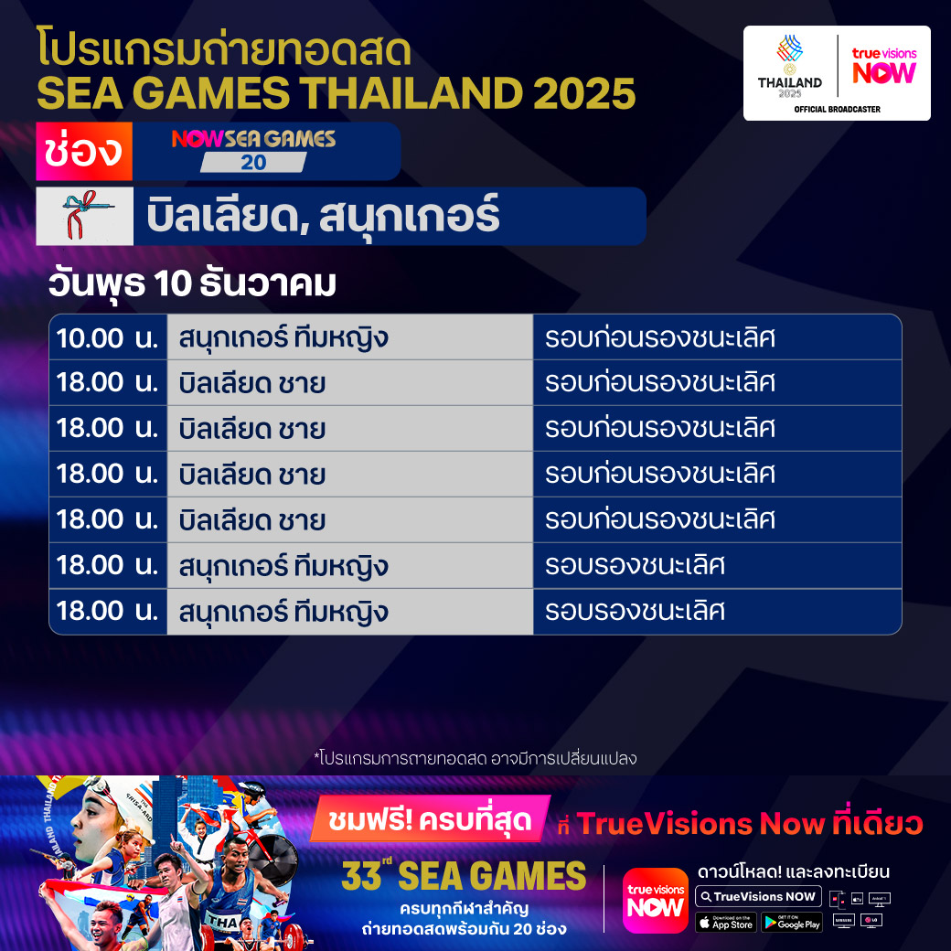 วันนี้มีอะไรดูที่ ทรูวิชั่นส์ ประจำวันพุธที่ 10 ธันวาคม 68 ยังคงมีกีฬาที่น่าสนใจให้ได้ตามลุ้นตามเชียร์กันเหมือนเดิม โดยในส่วนของฟุตบอลนั้นยังมีศึก ยูฟ่า แชมเปี้ยนส์ ลีก รอบ ลีก เฟส ให้ได้ตามเชียร์กันต่อ ส่วนกีฬาซีเกมส์ 2025 ยังมีถ่ายทอดสดหลายชิดกีฬาให้ได้ติดตามกัน นอกจากนี้กีฬาอื่นๆ ยังมีศึก เวิลด์ สนุกเกอร์ ทัวร์ รายการ ชู้ตเอาท์ และ วอลเลย์บอล วี-ลีก งานนี้ ทรูวิชั่นส์ จัดเต็มให้ชมกันถึงบ้าน