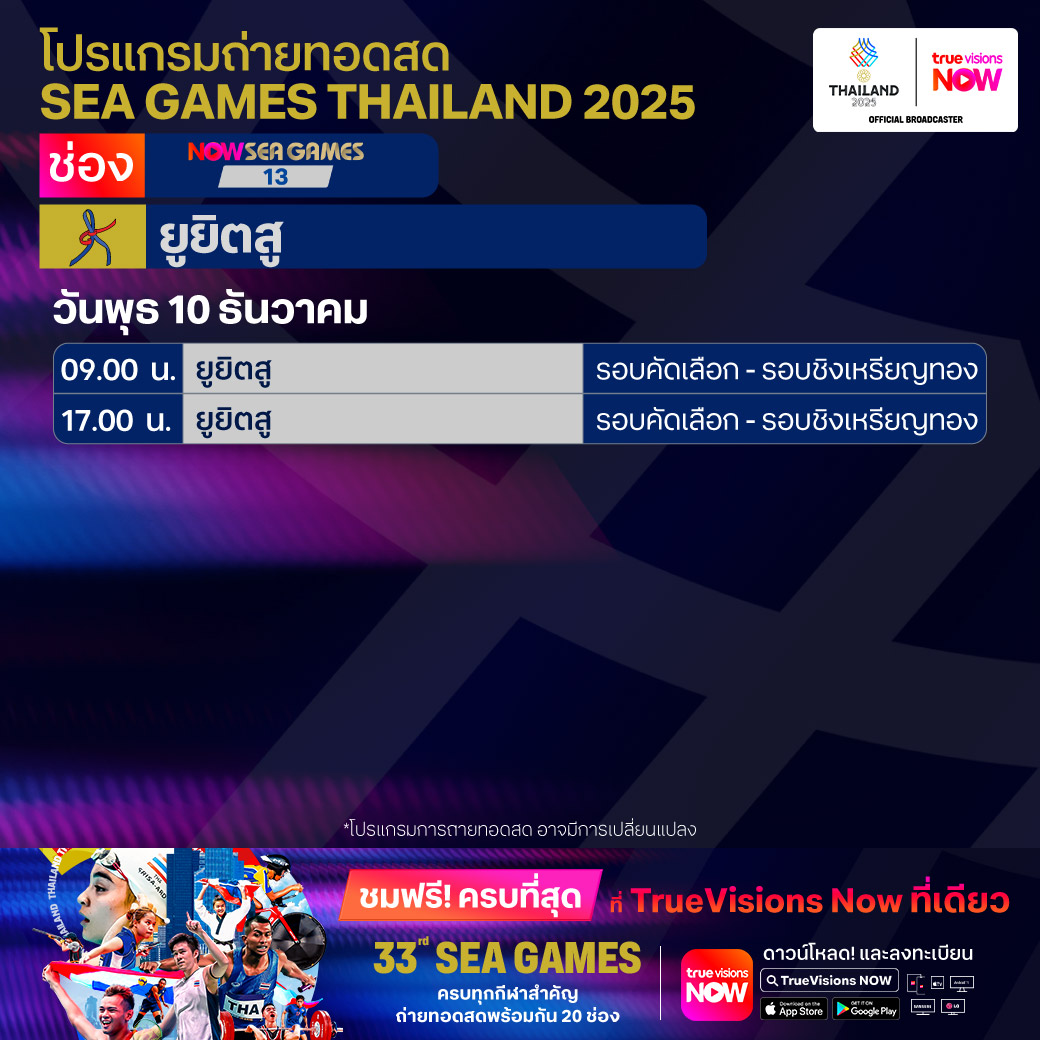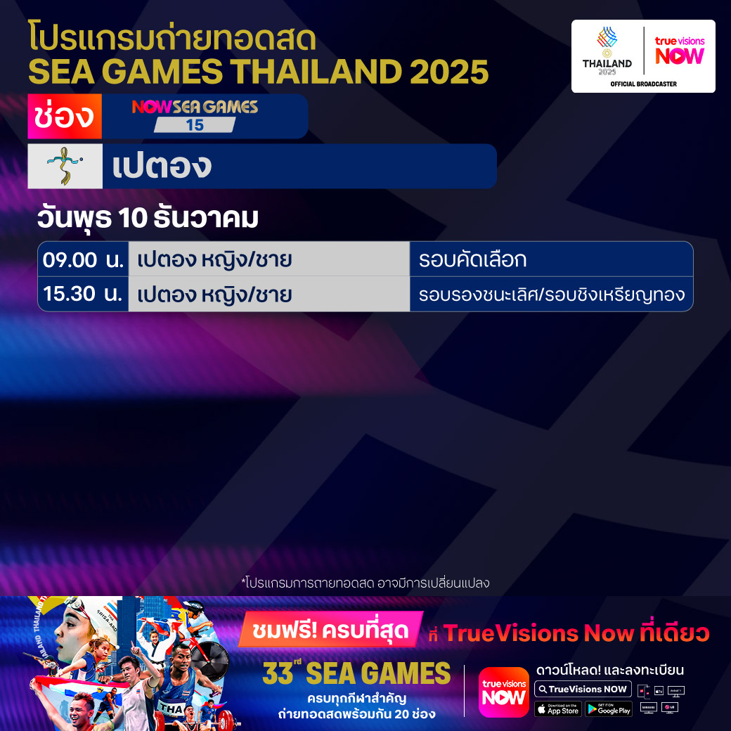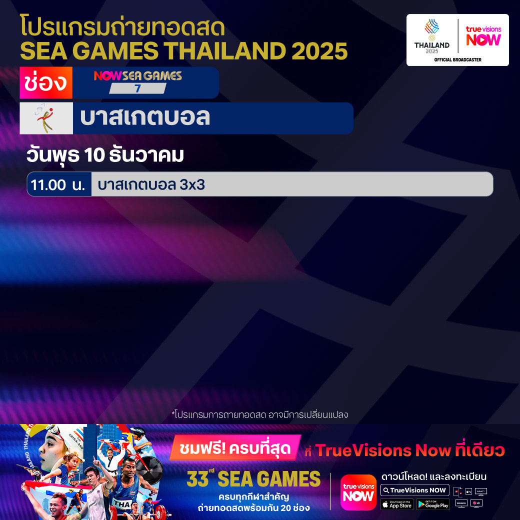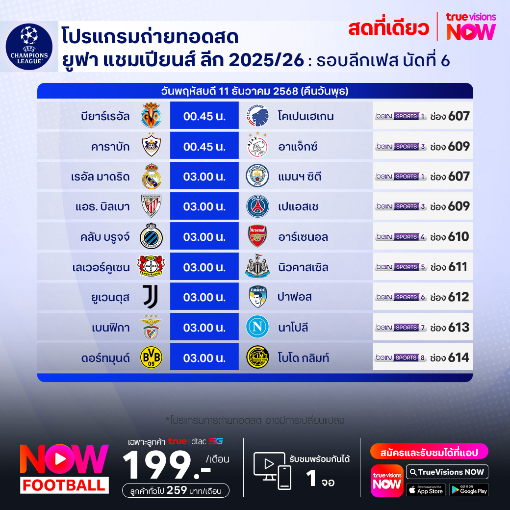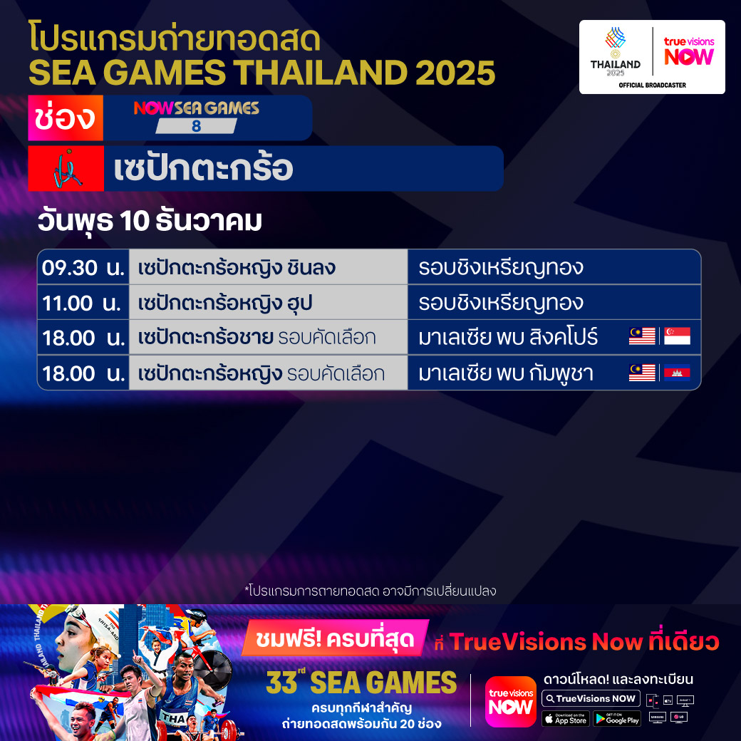 วันนี้มีอะไรดูที่ ทรูวิชั่นส์ ประจำวันพุธที่ 10 ธันวาคม 68 ยังคงมีกีฬาที่น่าสนใจให้ได้ตามลุ้นตามเชียร์กันเหมือนเดิม โดยในส่วนของฟุตบอลนั้นยังมีศึก ยูฟ่า แชมเปี้ยนส์ ลีก รอบ ลีก เฟส ให้ได้ตามเชียร์กันต่อ ส่วนกีฬาซีเกมส์ 2025 ยังมีถ่ายทอดสดหลายชิดกีฬาให้ได้ติดตามกัน นอกจากนี้กีฬาอื่นๆ ยังมีศึก เวิลด์ สนุกเกอร์ ทัวร์ รายการ ชู้ตเอาท์ และ วอลเลย์บอล วี-ลีก งานนี้ ทรูวิชั่นส์ จัดเต็มให้ชมกันถึงบ้าน